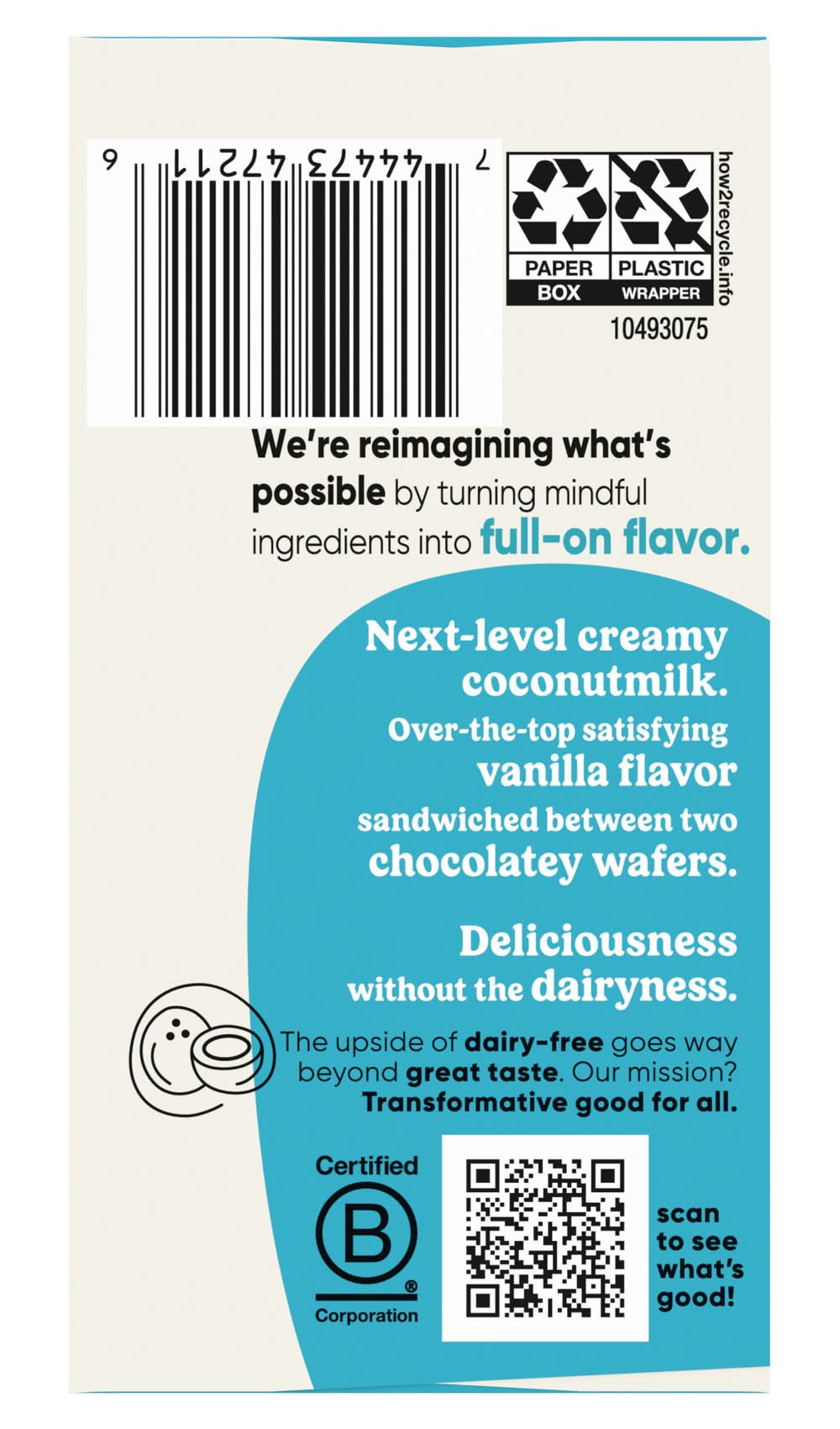Ingredients: INGREDIENTS: NON-DAIRY FROZEN DESSERT (ORGANIC COCONUTMILK [FILTERED WATER; ORGANIC COCONUT]; ORGANIC CANE SUGAR; ORGANIC COCONUT OIL; ORGANIC TAPIOCA SYRUP; PEA PROTEIN; LOCUST BEAN GUM; GUAR GUM; NATURAL FLAVOR; VANILLA BEAN), WAFER (WHEAT FLOUR; CANE SUGAR; PALM OIL; ORGANIC BROWN RICE SYRUP; CARAMEL COLOR; BAKING SODA; SUNFLOWER LECITHIN; COCOA [PROCESSED WITH ALKALI]; SALT; NATURAL VANILLA FLAVOR) Contains: Contains coconut and wheat. Produced in a facility that also processes soy, peanuts, and other tree nuts. We have a rigorous allergen testing program and apply strict quality control measures in an effort to prevent contamination by undeclared food allergens.