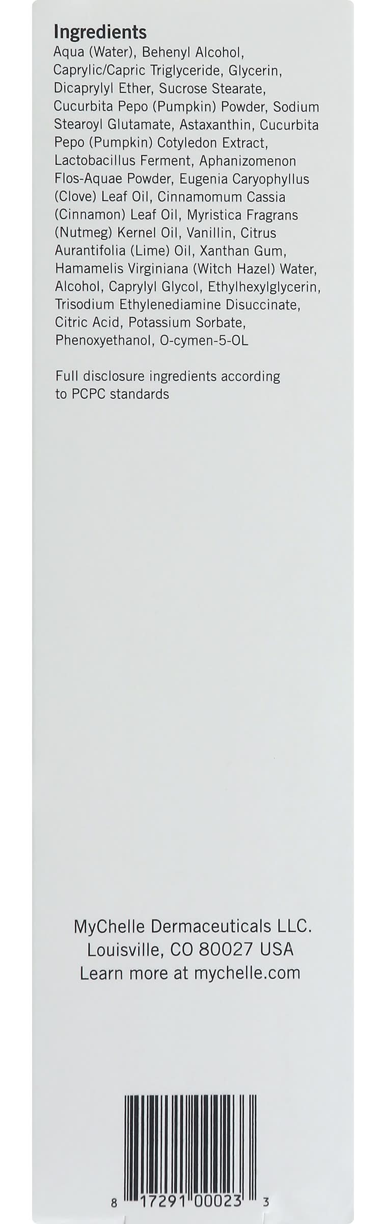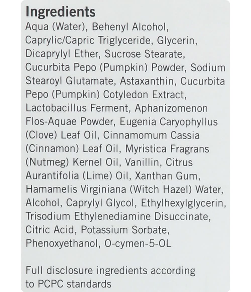 Ingredients: Aqua (Water), Behenyl Alcohol, Caprylic/Capric Triglyceride, Glycerin, Dicaprylyl Ether, Sucrose Stearate, Cucurbita Pepo (Pumpkin) Powder, Sodium Stearoyl Glutamate, Astaxanthin, Cucurbita Pepo (Pumpkin) Cotyledon Extract, Lactobacillus Ferment, Aphanizomenon Flos-Aquae Powder, Eugenia Caryophyllus (Clove) Leaf Oil, Cinnamomum Cassia (Cinnamon) Leaf Oil, Myristica Fragrans (Nutmeg) Kernel Oil, Vanillin, Citrus Aurantifolia (Lime) Oil, Xanthan Gum, Hamamelis Virginiana (Witch Hazel) Water, Alcohol, Caprylyl Glycol, Ethylhexylglycerin, Trisodium Ethylenediamine Disuccinate, Citric Acid, Potassium Sorbate, Phenoxyethanol, O-Cymen-5-OL
