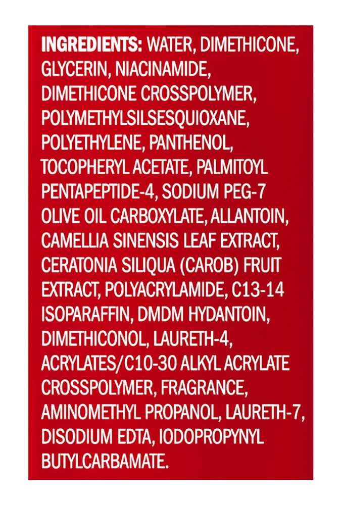 Ingredients: Water, Dimethicone, Glycerin, Niacinamide, Dimethicone Crosspolymer, Polymethylsilsesquioxane, Polyethylene, Panthenol, Tocopheryl Acetate, Palmitoyl Pentapeptide-4, Sodium PEG-7 Olive Oil Carboxylate, Allantoin, Camellia Sinensis Leaf Extract, Ceratonia Siliqua (Carob) Fruit Extract, Polyacrylamide, C13-14 Isoparaffin, DMDM Hydantoin, Dimethiconol, Laureth-4, Acrylates/C10-30 Alkyl Acrylate Crosspolymer, Fragrance, Aminomethyl Propanol, Laureth-7, Disodium EDTA, Iodopropynyl Butylcarbamate