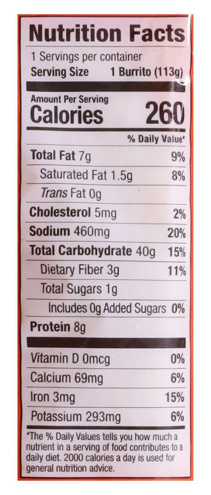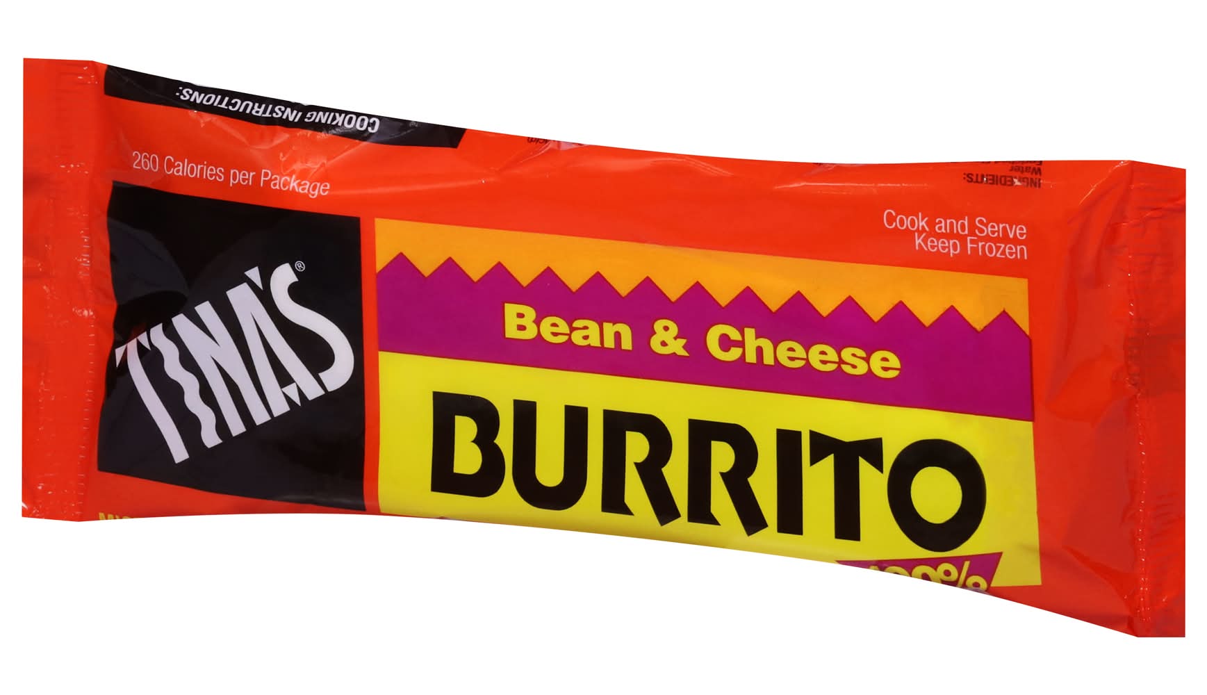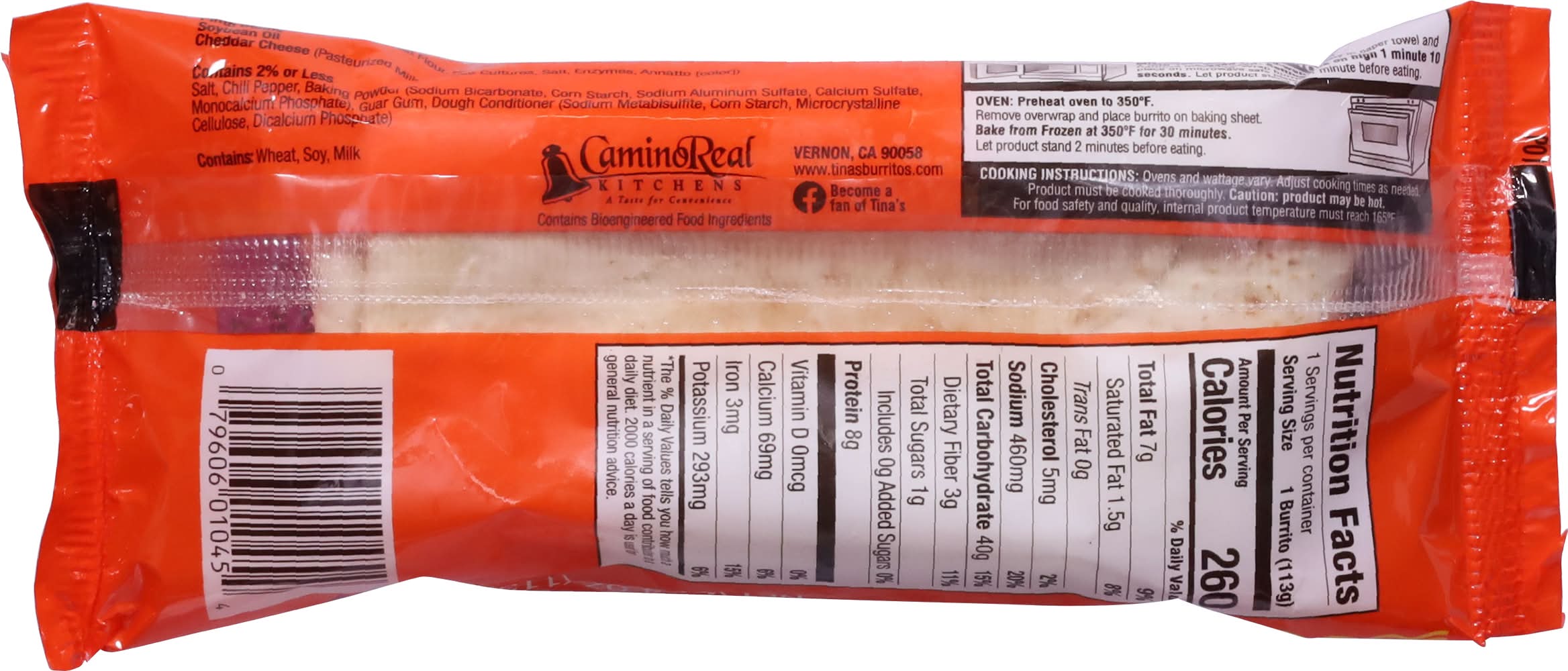 260 calories per package. Contains bioengineered food ingredients. Cook & serve. Microwaveable. Become a fan of tina's. • Flavor: Bean & cheese • Camino Real Foods, Vernon, CA.