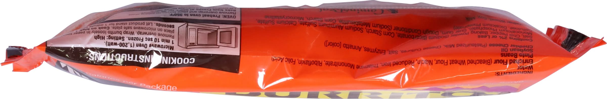 Ingredients: Water, Enriched Flour (Bleached Wheat Flour, Niacin, Reduced Iron, Thiamin Mononitrate, Riboflavin, Folic Acid) Pinto Beans, Soybean Oil, Cheddar Cheese (Pasteurized Milk, Cheese Cultures, Salt, Enzymes, Annatto [Color]), Contains 2% or Less Salt, Chili Pepper, Baking Powder (Sodium Bicarbonate, Corn Starch, Sodium Aluminum Sulfate, Calcium Sulfate, Monocalcium Phosphate), Guar Gum, Dough Conditioner (Sodium Metabisulfite, Corn Starch, Microcrystalline Cellulose, Dicalcium Phosphate) Contains: Wheat, Soybeans, Milk, Corn, Sulfites
