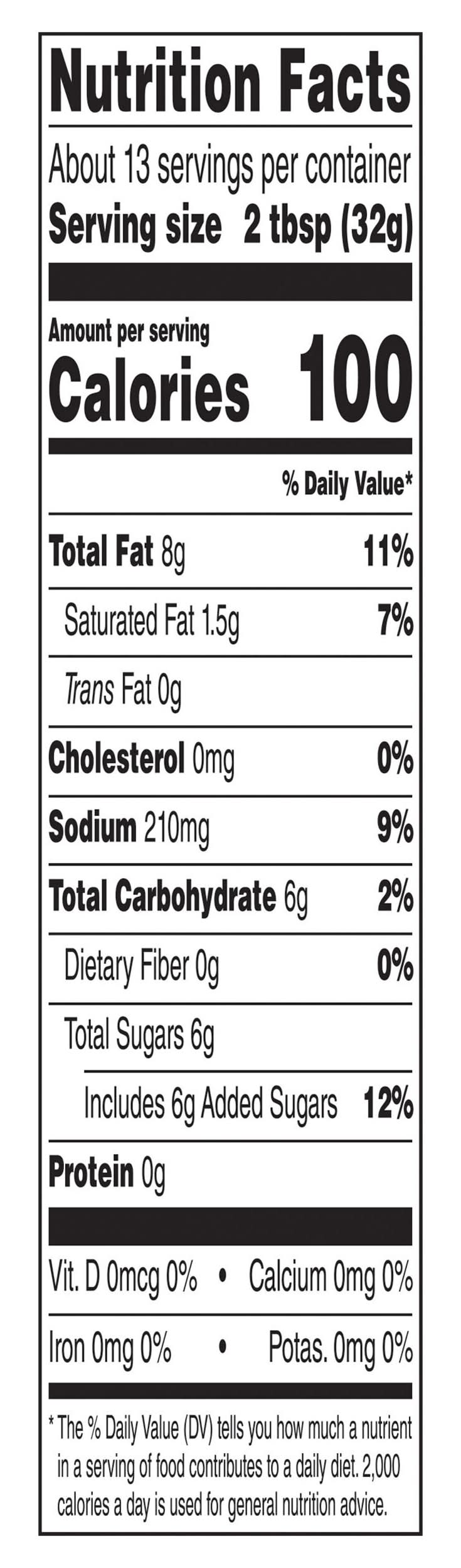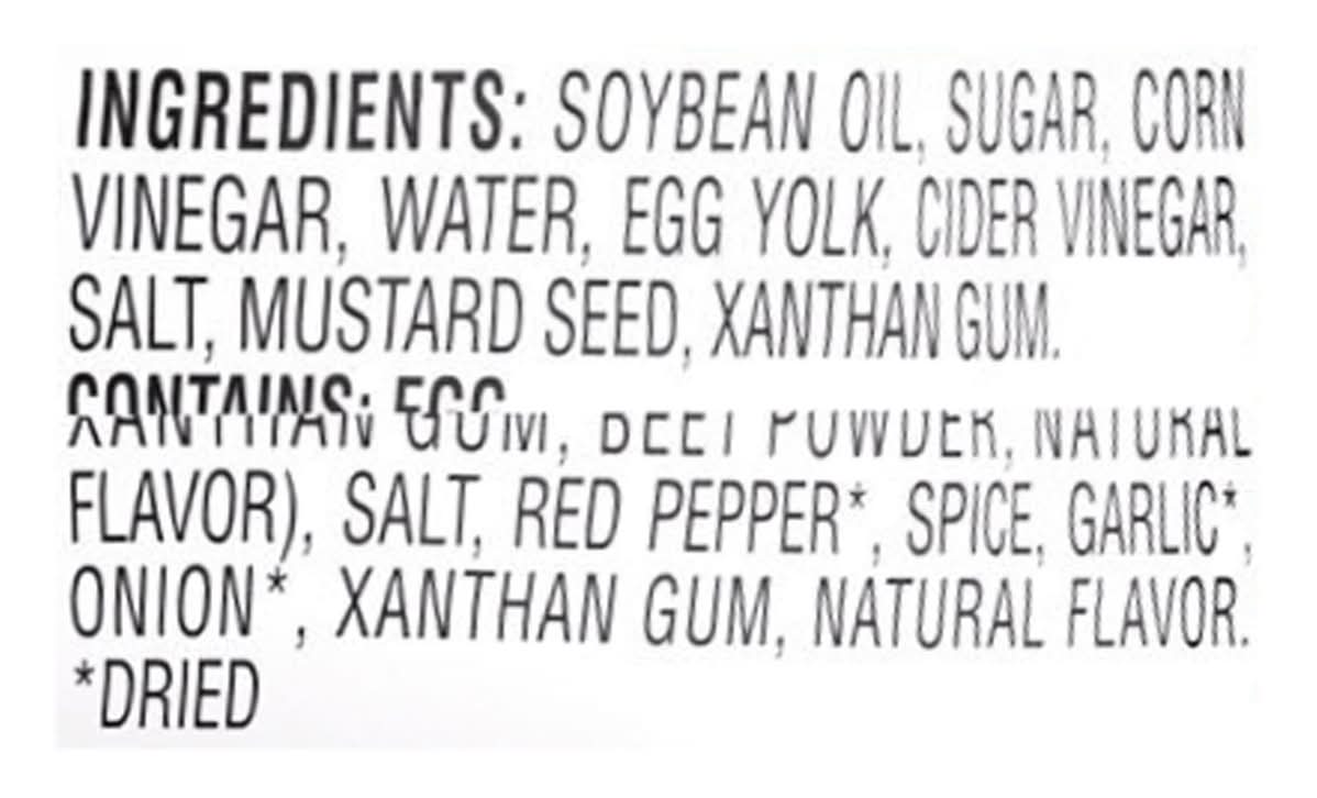 Ingredients: Soybean Oil, Sugar, Corn Vinegar, Water, Egg Yolk, Cider Vinegar, Salt, Mustard Seed, Xanthan Gum, Beet Powder, Natural Flavor), Salt, Red Pepper*, Spice, Garlic*, Onion*, Xanthan Gum, Natural Flavor, * Dried Contains: Soybeans, Corn, Eggs, Mustard