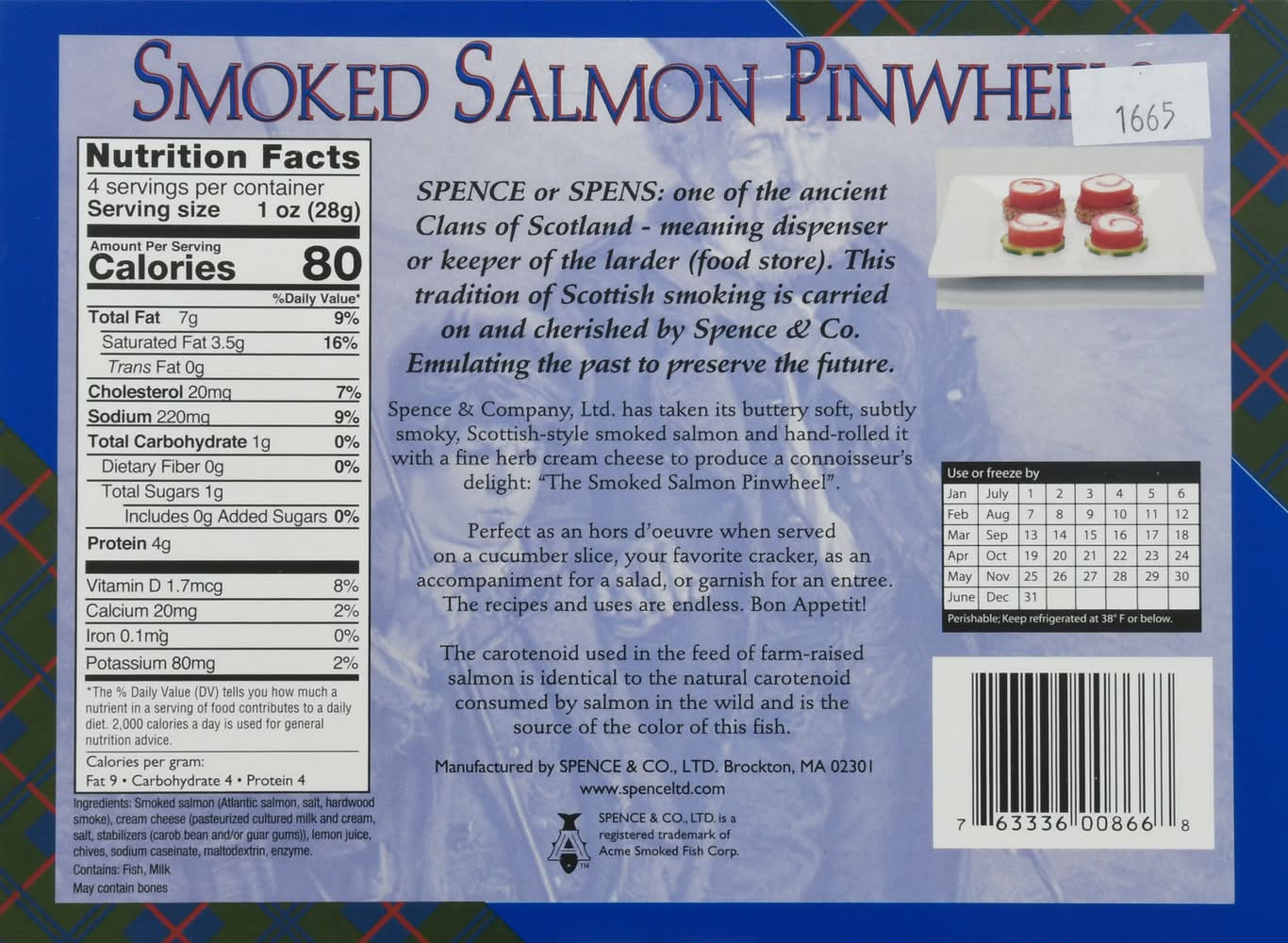 Ingredients: Smoked Salmon (Atlantic Salmon, Salt, Hardwood Smoke), Cream Cheese (Pasteurized Cultured Milk and Cream, Salt, Stabilizers (Carob Bean and/or Guar Gums)), Lemon Juice, Chives, Sodium Caseinate, Maltodextrin, Enzyme Contains: Fish, Milk