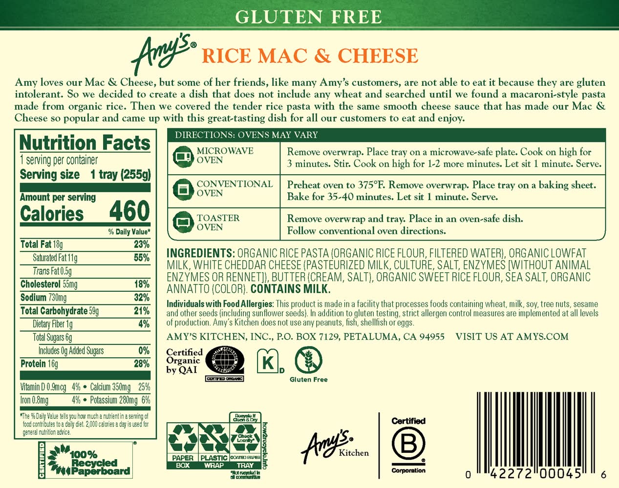 Certified Organic By Quality Assurance International (Qai). Gluten Free. If It'S Organic It'S Non Gmo. Microwave Or Regular Oven. Amy Loves Our Mac & Cheese, But Some Of Her Friends, Like Many Amy'S Customers, Are Not Able To Eat It Because They Are Gluten Intolerant. So We Decided To Create A Dish That Does Not Include Any Wheat, And Searched Until We Found A Macaroni-Style Pasta Made From Organic Rice. Then We Covered The Tender Rice Pasta With The Same Smooth Cheese Sauce That Has Made Our Mac & Cheese So Popular, And Came Up With This Great-Tasting Dish For All Our Customers To Eat And Enjoy. From Our Home To Yours. Family Owned Since 1987. After The Birth Of Our Daughter Amy In 1987, We Found There Was Little Time To Prepare The Quality Homemade Food We Normally Ate. Realizing There Were Others Like Ourselves, We Started Amy'S Kitchen To Prepare Delicious Meals For Those Who Care About The Food They Eat But Are Often Too Busy To Cook. We Use Only The Finest Ingredients And Prepare Them With The Same Careful Attention In Our Kitchen As You Would In Your Own Home. Certified 100% Recycled Paperboard. • Number of servings: 1 • Packaging: Reusable