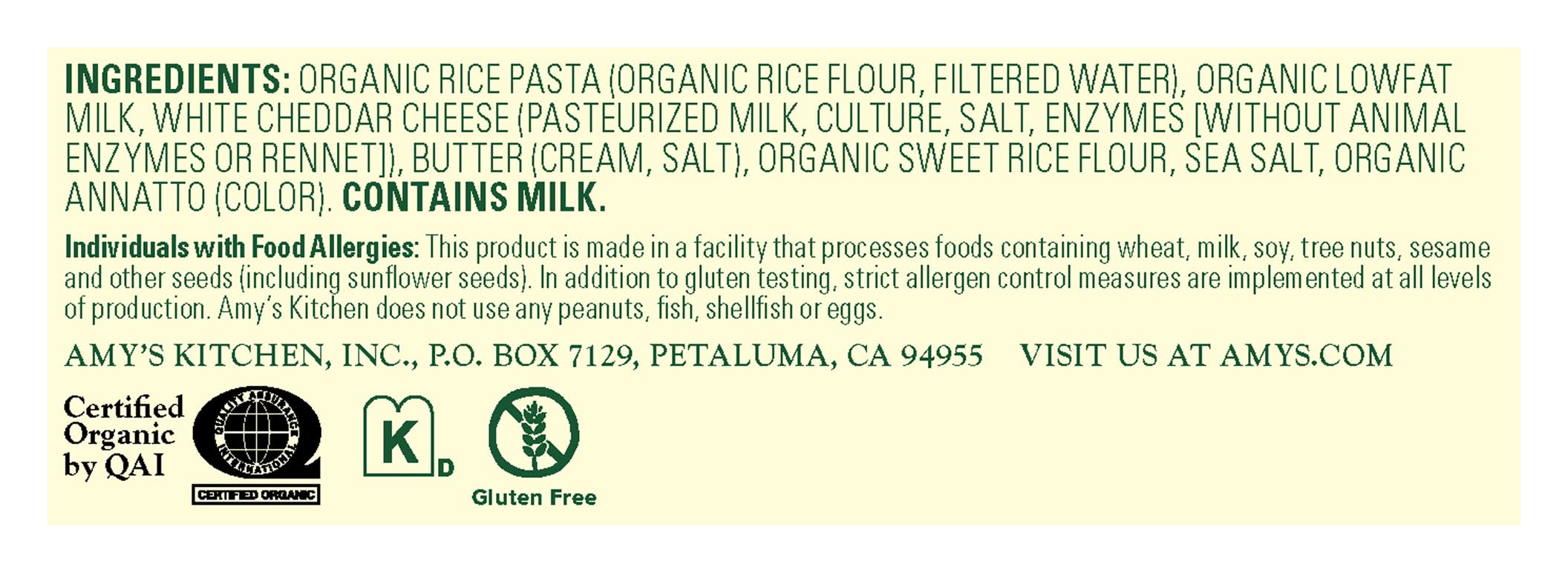 Ingredients: Organic Rice Pasta (Organic Rice Flour Water), Organic Lowfat Milk, White Cheddar Cheese (Pasteurized Milk Culture Salt Enzymes), Butter (Cream Salt), Organic Sweet Rice Flour, Sea Salt, Organic Annatto (Color) Contains: Milk