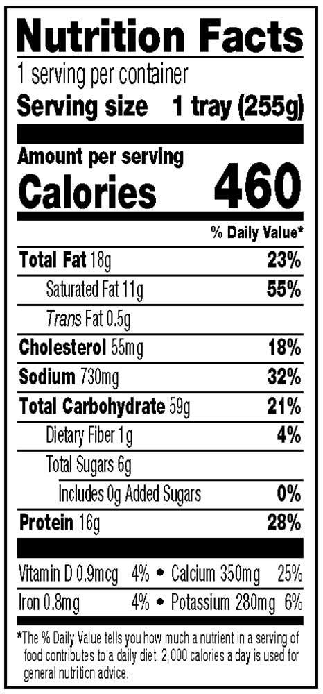 Directions for use: Directions: Ovens may vary. Microwave Oven: Remove over wrap. Place tray on a microwave-safe plate. Cook on high for 3 minutes. Stir. Cook on high for 1-2 more minutes. Let sit 1 minute. Serve. Conventional Oven: Preheat oven to 375 degrees F. Remove overwrap. Place tray on a baking sheet. Bake for 35-40 minutes. Let sit 1 minute. Serve. Toaster Oven: Remove overwrap and tray. Place in an oven-safe dish. Follow conventional oven directions. Perishable. Keep frozen. Storage recommendation: Perishable. Keep frozen.