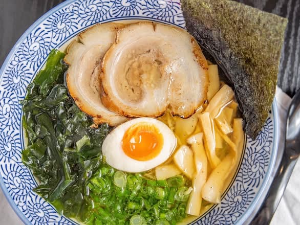 Chicken broth with soy sauce base with pork chashu, green onions, menma, bok choy, egg, nori