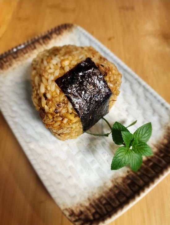 Seasoned rice ball with roast pork, wrapped with seaweed.