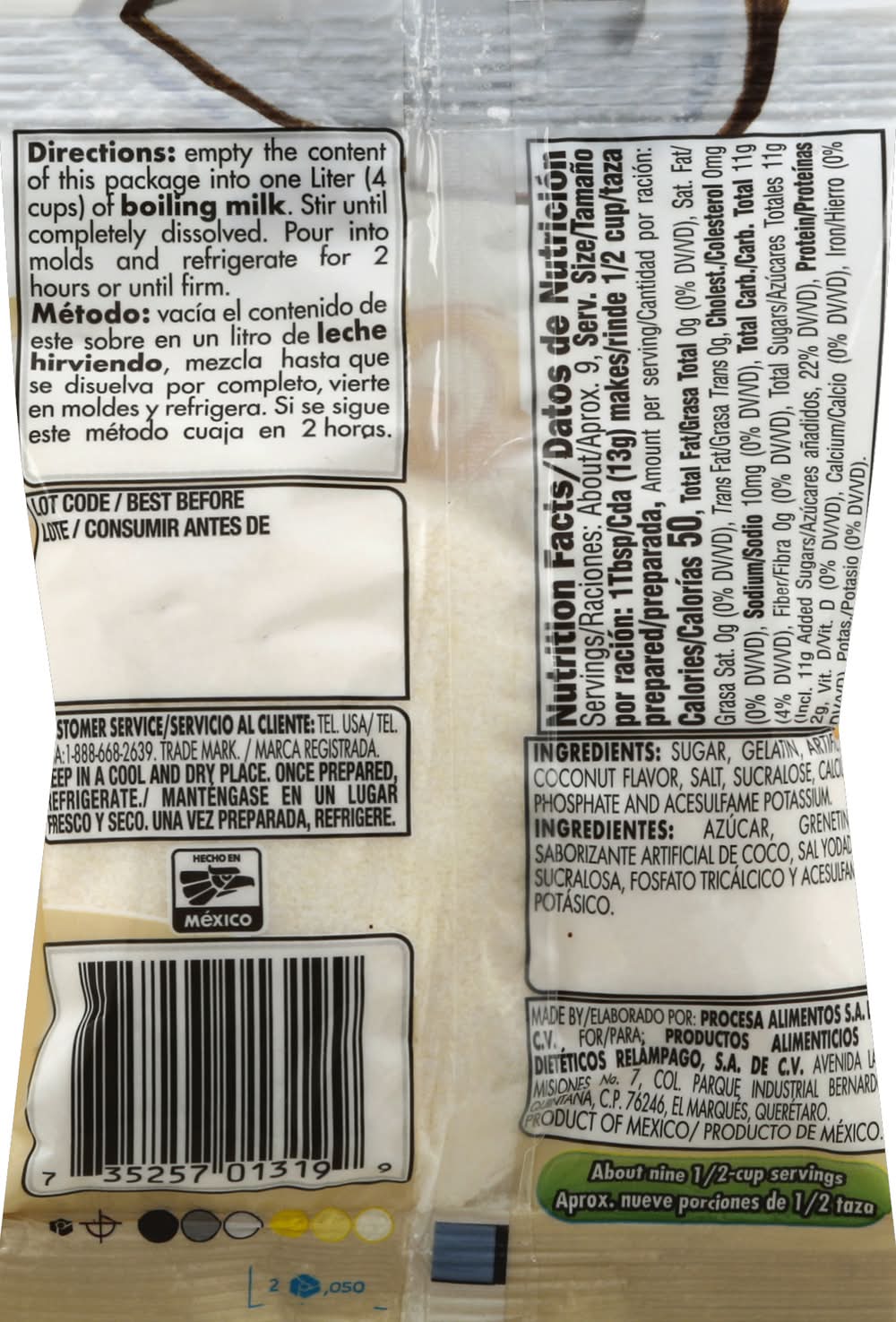 Gelatin Dessert, Coconut Procesa Alimentos, Avenida Las Misiones No. 7 Col Parque Industrial Bernardo Quintana CP 76246 El Marques, Queretaro