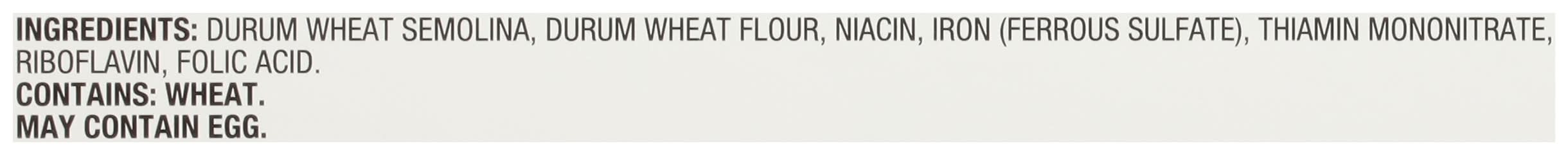 Ingredients: Durum Wheat Semolina, Durum Wheat Flour, Niacin, Iron (Ferrous Sulfate), Thiamin Mononitrate, Riboflavin, Folic Acid Contains: Wheat, Eggs