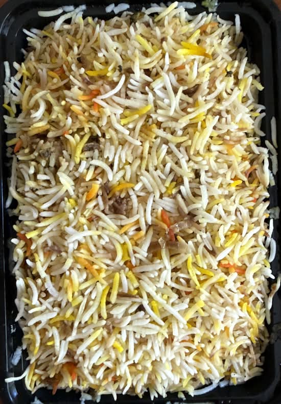 Aromatic rice dish, prepared in layers, with rice, chicken leg quarters & spices, in a traditional recipe from Lucknow (India).