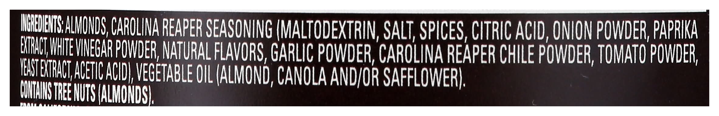 Ingredients: Almonds, Carolina Reaper Seasoning (Maltodextrin, Salt, Spices, Citric Acid, Onion Powder, Paprika Extract, White Vinegar Powder, Natural Flavors, Garlic Powder, Carolina Reaper Chile Powder, Tomato Powder, Yeast Extract, Acetic Acid), Vegetable Oil (Almond, Canola and/or Safflower) Contains: Tree Nuts