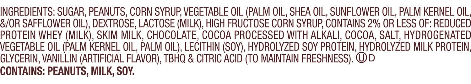Ingredients: PEANUTS, SUGAR, MILK CHOCOLATE [SUGAR; COCOA BUTTER; CHOCOLATE; SKIM MILK; MILK FAT; LACTOSE; LECITHIN (SOY); PGPR], CORN SYRUP, DEXTROSE, VEGETABLE OIL [PALM OIL; SHEA OIL; SUNFLOWER OIL; PALM KERNEL OIL; AND/OR SAFFLOWER OIL], CONTAINS 2% OR LESS OF: HIGH FRUCTOSE CORN SYRUP, CHOCOLATE, SKIM MILK, SALT, COCOA PROCESSED WITH ALKALI, WHEY (MILK), HYDROGENATED VEGETABLE OIL [PALM KERNEL OIL; PALM OIL], EGG WHITES, CORNSTARCH, HYDROLYZED MILK PROTEIN, GLYCERIN, LECITHIN (SOY), TBHQ AND CITRIC ACID, TO MAINTAIN FRESHNESS, VANILLIN, ARTIFICIAL FLAVOR Contains: Peanuts, Milk, Lactose, Soybeans, Eggs, Tree Nuts, Corn
