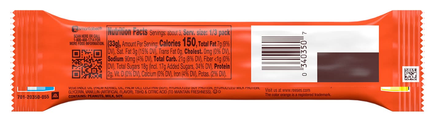 Whenever you need a break from the everyday hustle, reach for apeanut butter and nougat candy bar and share another with some of your best mates. It's a perfectly delicious treat that helps you kick back and relax. Bite into a chewy,filled candy bar during lunch breaks, sporting events, movies or whenever you need a delicious treat. Have them ready on dessert trays for your birthday party celebrations, store a bag in the office break room or add a bunch in your pantry for baking. Crush up a few nougat candy bars to supplement your brownie, cookie and cupcake recipes, along with any other snack that needs a bit of peanut butter and chocolatey yumminess. These individually wrapped, kosher, gluten free • Brand: Reese's • Flavor: Milk chocolate-peanut butter • gluten-free • Number of servings: 3 • The Hershey Company, Hershey, Pa.