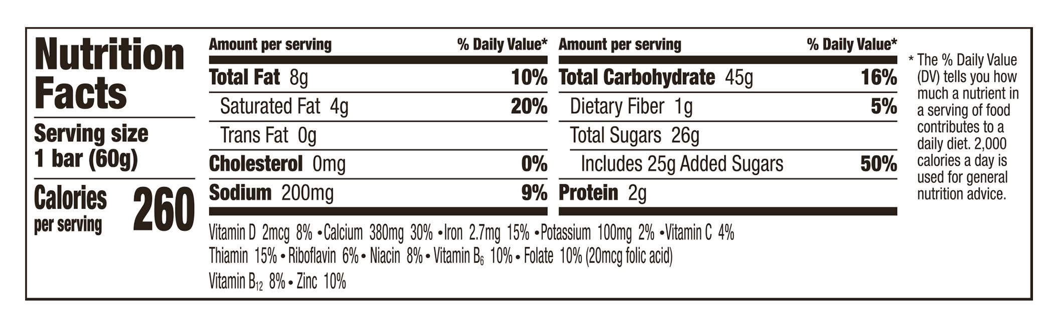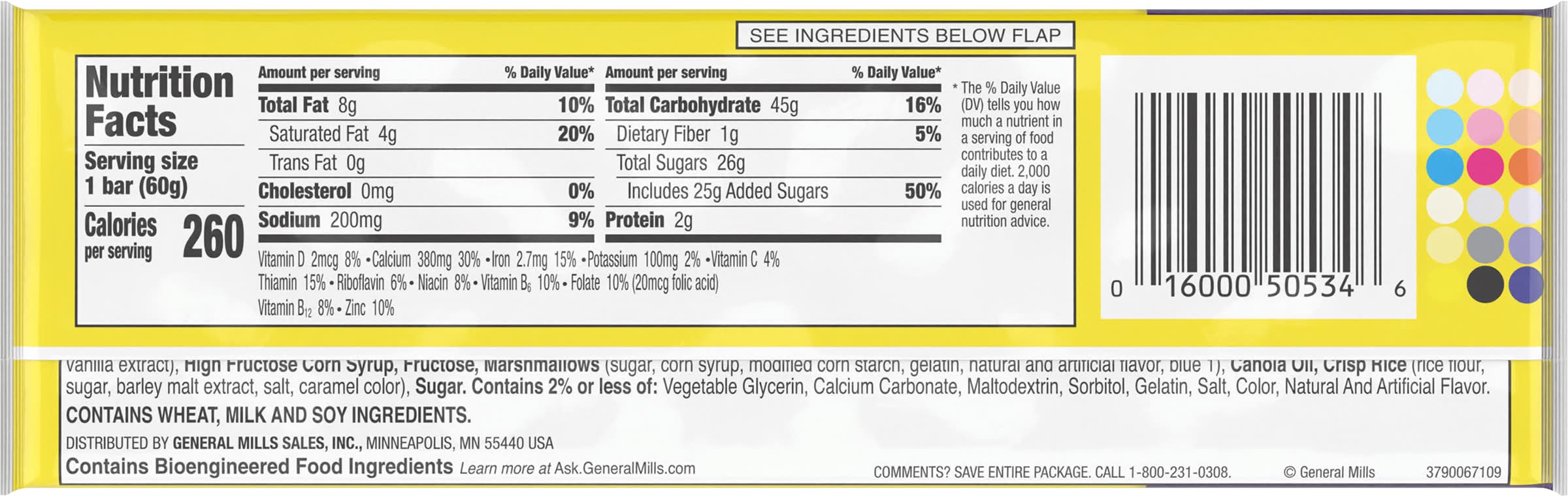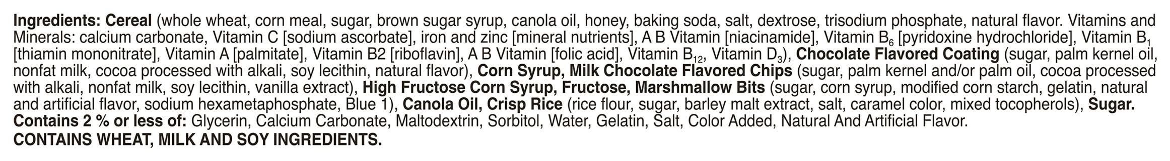 Ingredients: Cereal (Whole Wheat, Corn Meal, Sugar, Brown Sugar Syrup, Canola Oil, Honey, Baking Soda, Salt, Dextrose, Trisodium Phosphate, Natural Flavor, Vitamins and Minerals: Calcium Carbonate, Vitamin C [Sodium Ascorbate], Iron and Zinc [Mineral Nutrients], a B Vitamin [Niacinamide], Vitamin B6 [Pyridoxine Hydrochloride], Vitamin B, [Thiamin Mononitrate], Vitamin A [Palmitate], Vitamin B2 [Riboflavin], a B Vitamin [Folic Acid], Vitamin B.2, Vitamin D3), Chocolate Flavored Coating (Sugar, Palm Kernel Oil, Nonfat Milk, Cocoa Processed with Alkali, Soy Lecithin, Natural Flavor), Corn Syrup, Milk Chocolate Flavored Chips (Sugar, Palm Kernel and/or Palm Oil, Cocoa Processed with Alkali, Nonfat Milk, Soy Lecithin, Vanilla Extract), High Fructose Corn Syrup, Fructose, Marshmallow Bits (Sugar, Corn Syrup, Modified Corn Starch, Gelatin, Natural and Artificial Flavor, Sodium Hexametaphosphate, Blue 1), Canola Oil, Crisp Rice (Rice Flour, Sugar, Barley Malt Extract, Salt, Caramel Color, Mixed Tocopherols), Sugar, Contains 2 % or Less of: Glycerin, Calcium Carbonate, Maltodextrin, Sorbitol, Water, Gelatin, Salt, Color Added, Natural and Artificial Flavor Contains: Wheat, Milk, Soybeans, Corn, Barley