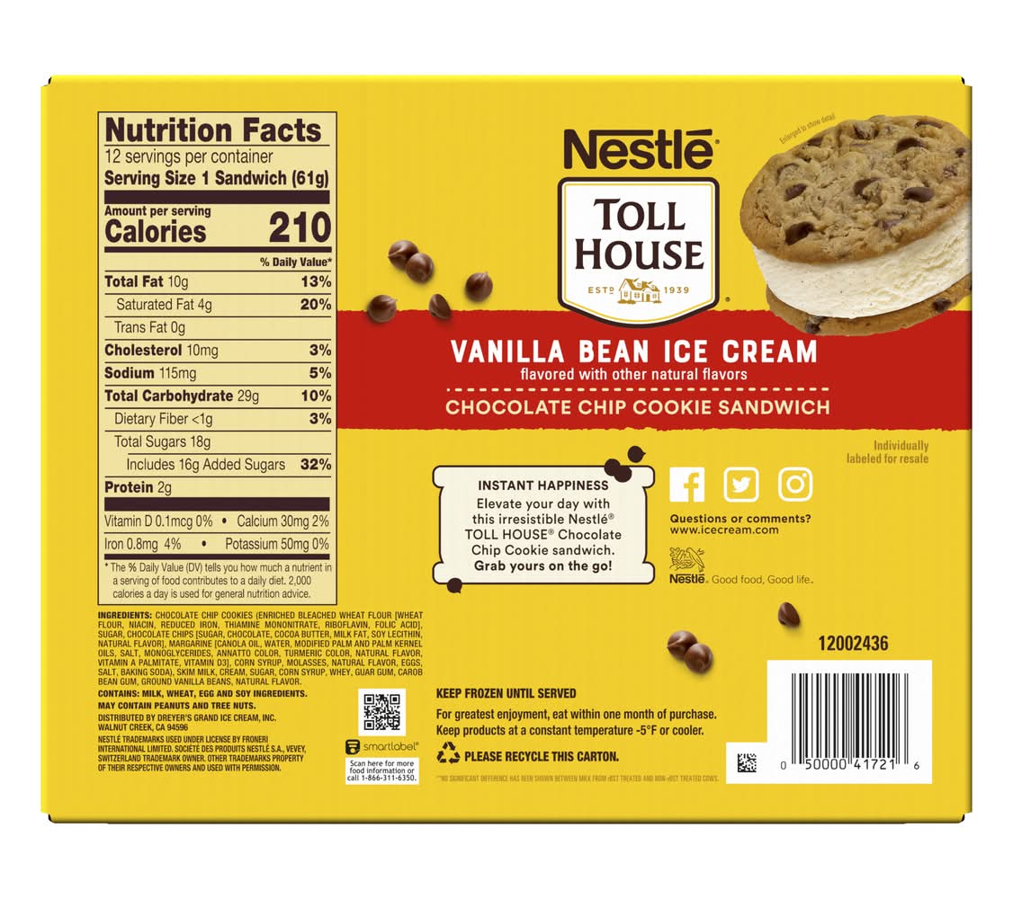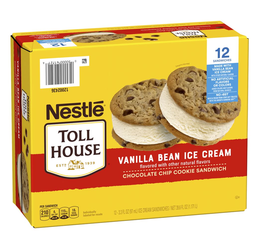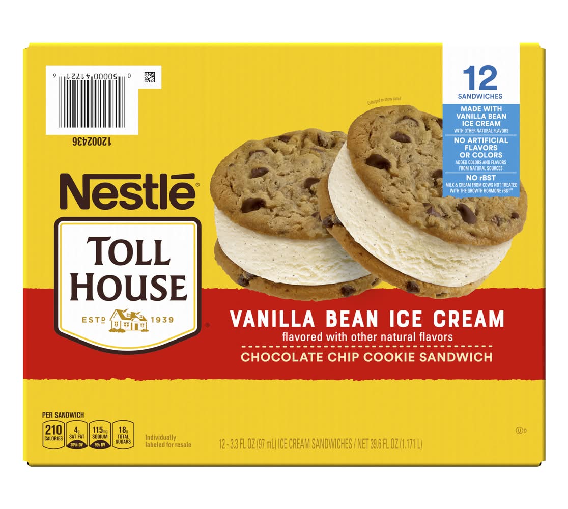 Nothings says delicious, home-baked cookies like Nestle Toll House, and so naturally there’s no better cookie to pair with frozen treats. Whether enjoyed as a classic chocolate chip cookie frozen dairy dessert sandwich or as cookie dough mixed into creamy vanilla goodness, Nestle Toll House frozen treats bring home-baked flavor to your favorite frozen desserts. • Flavor: Vanilla bean • Packaging: Reusable