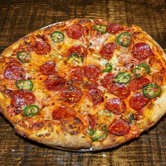 Cheese, tomato sauce, pepperoni, and fresh jalapenos. Our pizzas are made with the finest blend of aged provolone, mozzarella and Parmesan cheeses, our own spiced pizza sauce, and imported olive oil.