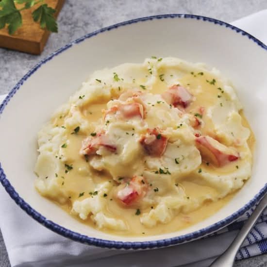 Maine and langostino lobster meat in a creamy lobster beurre blanc sauce over mashed potatoes. 350 Cal