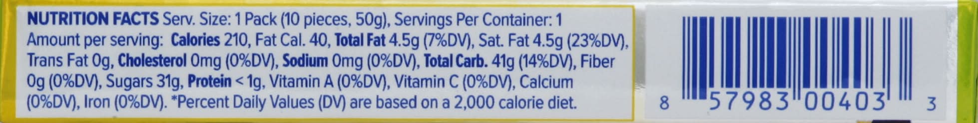 Ingredients: Glucose Syrup, Sugar, Hydrogenated Palm Kernel Oil, Gelatin, Lactic Acid, Natural and Artificial Flavors, Emulsifiers (Sucrose Fatty Acid Esters, Sorbitan Monostearate), Banana Powder, Concentrated Yogurt, Citric Acid, Color (Beta Carotene) Contains: Milk, Soybeans
