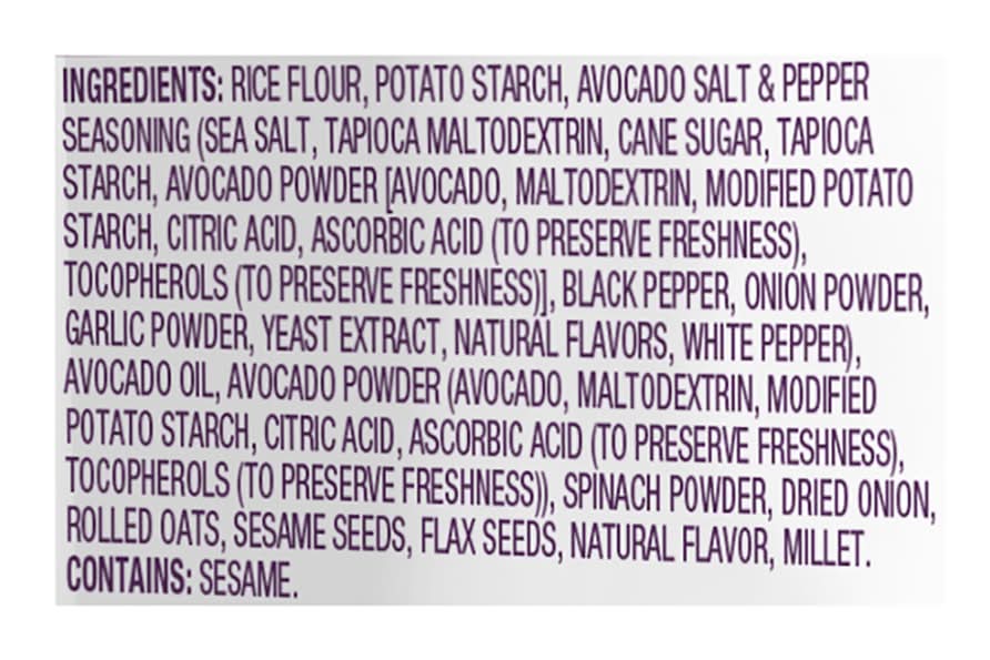 Ingredients: Rice Flour, Potato Starch, Avocado Salt & Pepper Seasoning (Sea Salt, Tapioca Maltodextrin, Cane Sugar, Tapioca Starch, Avocado Powder [Avocado, Maltodextrin, Modified Potato Starch, Citric Acid, Ascorbic Acid (to Preserve Freshness), Tocopherols (to Preserve Freshness)], Black Pepper, Onion Powder, Garlic Powder, Yeast Extract, Natural Flavors, White Pepper), Avocado Oil, Avocado Powder (Avocado, Maltodextrin, Modified Potato Starch, Citric Acid, Ascorbic Acid (to Preserve Freshness), Tocopherols (to Preserve Freshness)), Spinach Powder, Dried Onion, Rolled Oats, Sesame Seeds, Flax Seeds, Natural Flavor, Millet Contains: Sesame, Oat