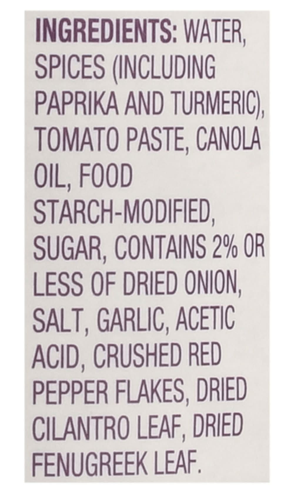 Ingredients: Water Tomato, Yogurt (Milk Skim Milk Cream, Bacterial Culture Tomato Paste, Food Starch-Modified, Cream, Spices (Including Paprika Turmeric and Smoked Paprika), Contains 2% or Less of Canola Oil, Dried Onion, Sugar, Garlic, Ginger, Salt, Crushed Red Pepper Flakes, Whey Protein Concentrate, Lactic Acid, Paprika Oleoresin (Color), Cumin Seed, Dried Cilantro Leaf Contains: Milk, Peanuts, Tree Nuts, Tree Nuts, Coconuts