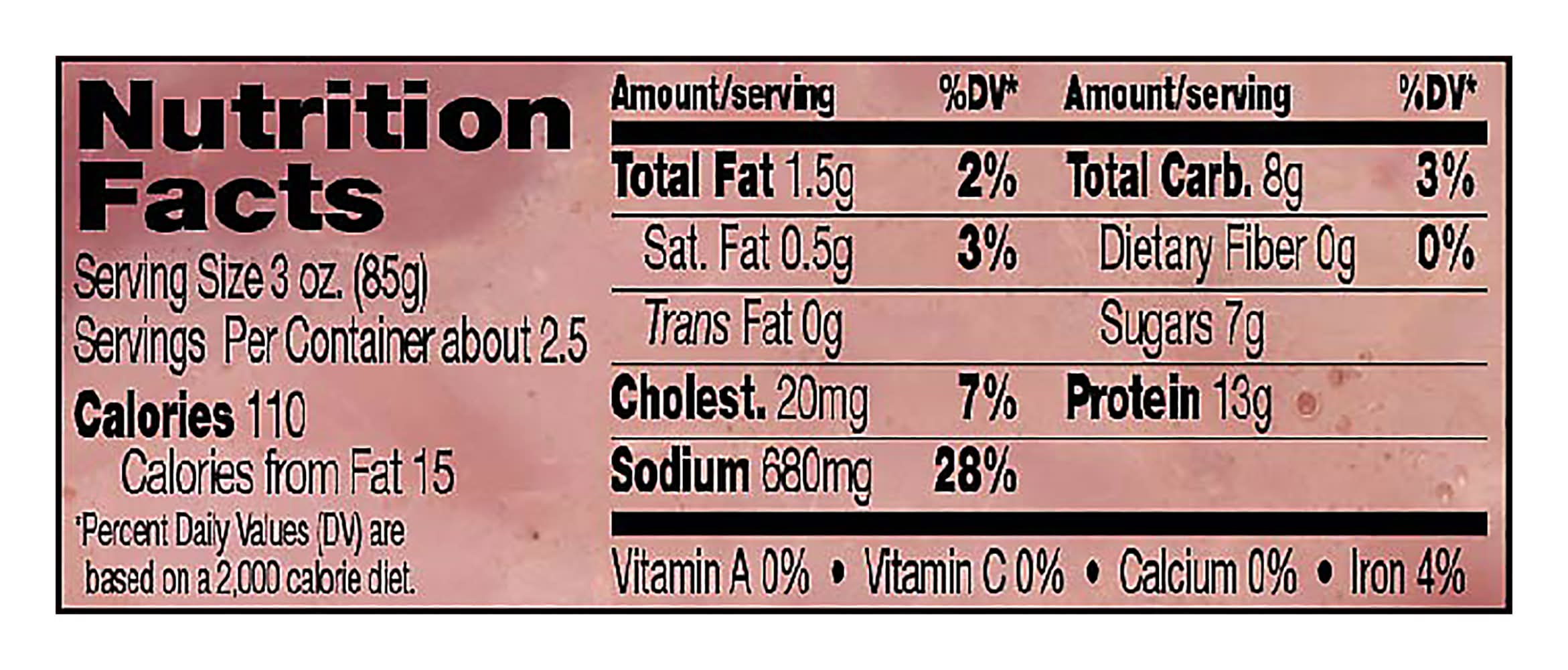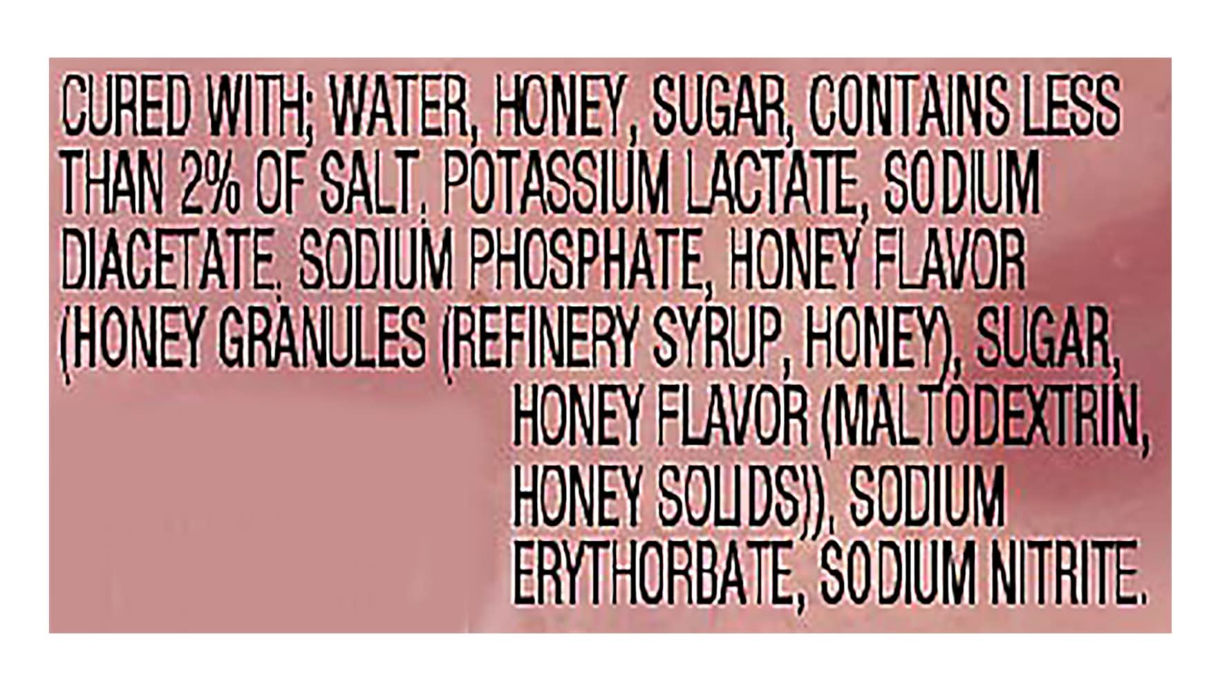 Ingredients: Cured with; Water, Honey, Sugar, Contains Less than 2% of Salt, Potassium Lactate, Sodium Diacetate, Sodium Phosphate, Honey Flavor (Honey Granules (Refinery Syrup, Honey), Sugar, Honey Flavor (Maltodextrin, Honey Solids)), Sodium Erythorbate, Sodium Nitrite