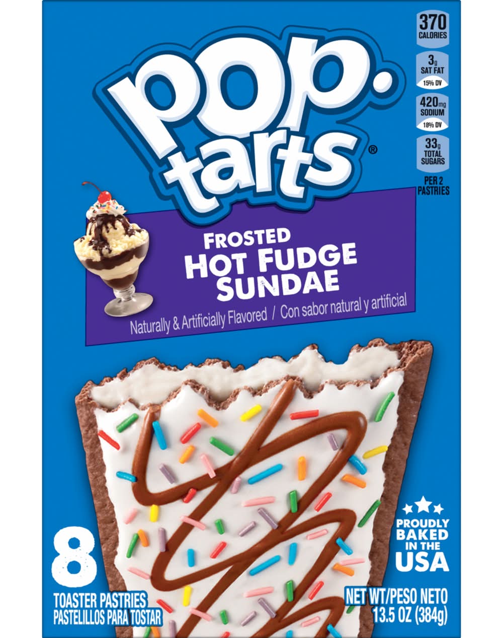 Pop-Tarts toaster pastries are the perfect sweet treat at breakfast, for lunch snack time, or dessert. Featuring a sweet hot fudge sundae-flavored filling and sprinkles on a soft pastry crust, this ready to eat treat is perfect for snack time for kids and adults on the go. Pack Pop-Tarts Frosted Hot Fudge Sundae in lunchboxes or backpacks when it's time for school snacking, or stock the office pantry with this individually wrapped grab and go adult snack time choice. Pop them in the toaster and pair with milk, create your own ice cream sandwiches, or incorporate into your favorite dessert recipe for a sweet treat. These irresistible snack time options for kids and adults provide a good source of three B vitamins. Stock your pantry with these shelf stable snack alternatives and enjoy ready to eat treats anytime. A flavor for everyone, including beloved classics like Frosted Strawberry or Frosted Cherry, or our more indulgent flavors, Frosted Cookies and Creme or Frosted Chocolate Fudge. • Flavor: Frosted hot fudge sundae • Kellogg Sales Co, Battle Creek, MI, 49016, • Packaging: Reusable