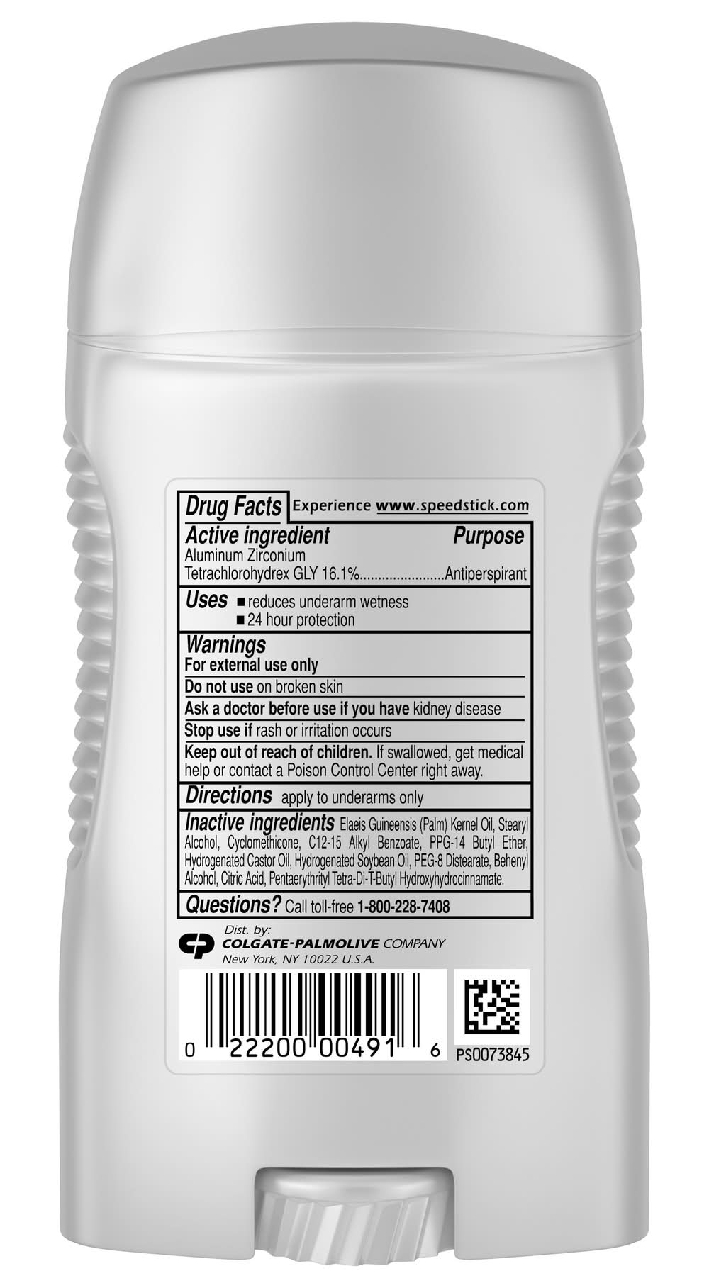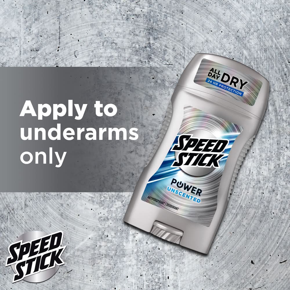 Feel clean, masculine and confident with Speed Stick Antiperspirant and Deodorant for Men, Unscented. This Speed Stick men’s antiperspirant provides 24 hour odor and wetness protection for maximum confidence. This Speed Stick men’s deodorant includes a comfort guard applicator for comfort and control. This solid stick deodorant for men keeps you dry all day. This unscented deodorant for men will help you smell great and feel confident all day. Speed Stick Men’s Antiperspirant and Deodorant provides 24 hour odor and wetness protection so you can feel fresh and dry all day. Feel confident to take on the day. The Speed Stick line of men’s deodorants and men’s antiperspirants come in a variety of scents and benefits. These include Zero, Aluminum Free, Irish Spring, Stainguard and Power variants. Speed Stick Irish Spring antiperspirant combines the protection of Speed Stick with the freshness of Irish Spring. Speed Stick Power antiperspirants provide 24 hour odor and wetness protection. Try them today to find the right deodorant and antiperspirant for you. Feel clean, masculine and confident with Speed Stick. Speed Stick deodorants and antiperspirants should only be applied directly underneath the arms. Remove the cap from the product. Turn the dial on the bottom clockwise to raise the deodorant or antiperspirant stick so that it is protruding from the container. Simply rub the deodorant or antiperspirant directly on the armpit and replace the cap. Colgate-Palmolive, New York,NY,USA,10022