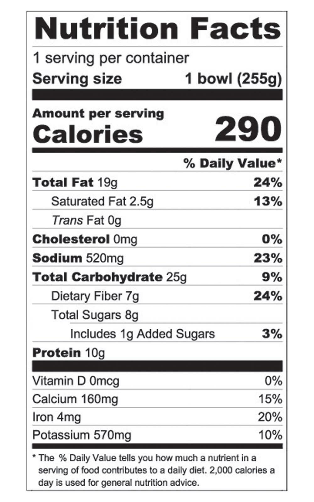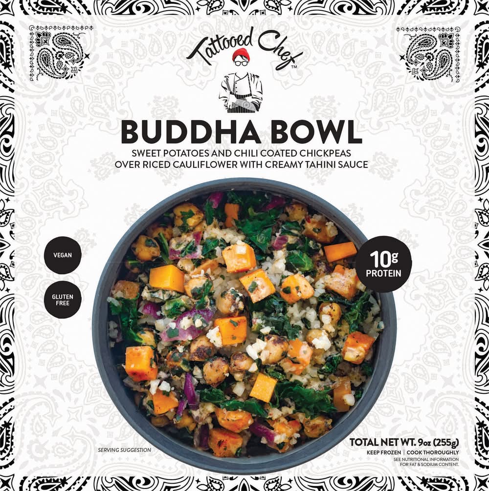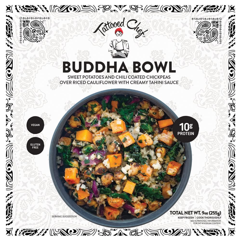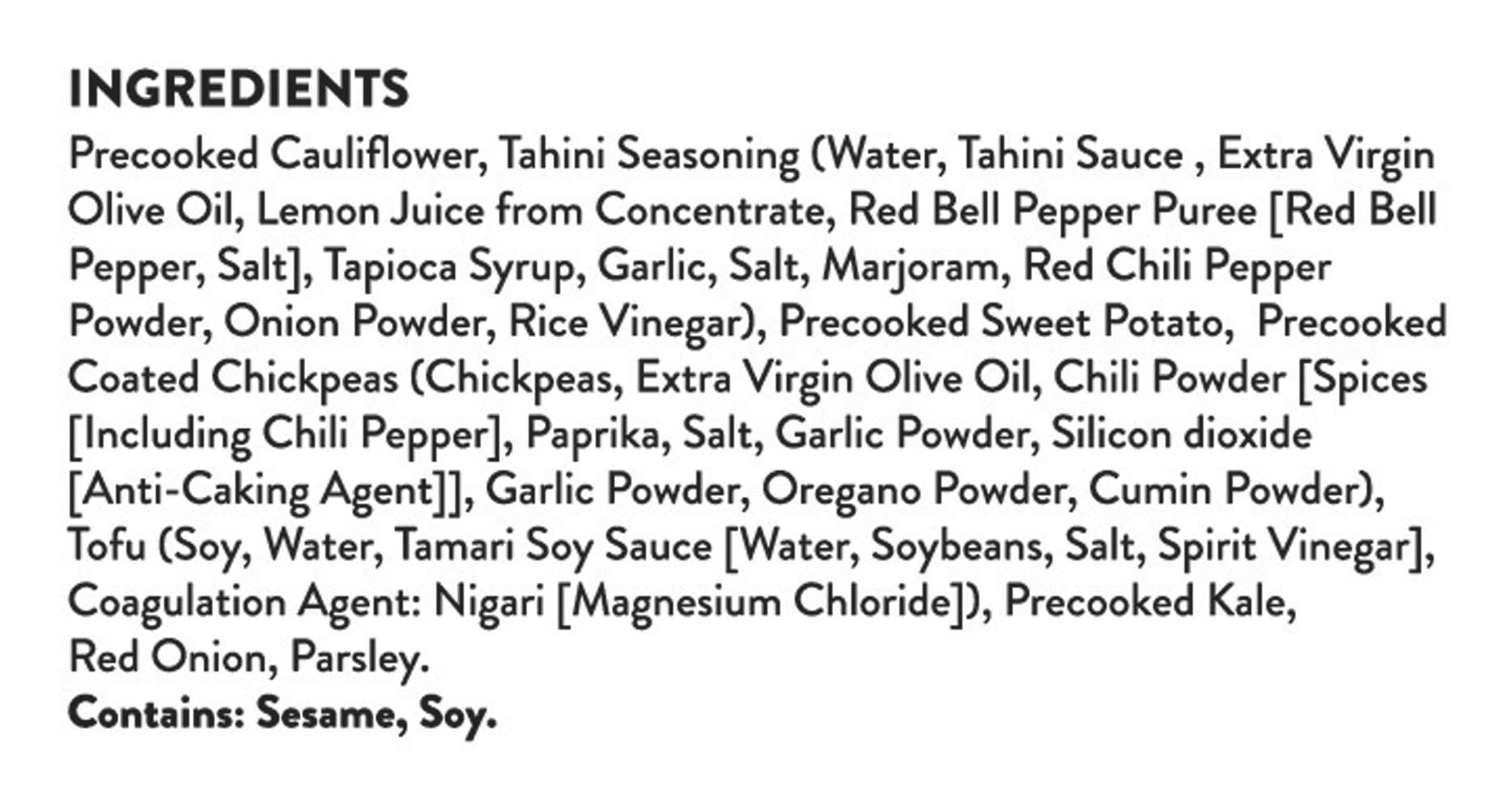 Ingredients: Precooked Cauliflower, Tahini Seasoning (Water, Tahini Sauce, Extra Virgin Olive Oil, Lemon Juice from Concentrate, Red Bell Pepper Puree [Red Bell Pepper, Salt], Tapioca Syrup, Garlic, Salt, Marjoram, Red Chili Pepper Powder, Onion Powder, Rice Vinegar), Precooked Sweet Potato, Precooked Coated Chickpeas (Chickpeas, Extra Virgin Olive Oil, Chili Powder [Spices [Including Chili Pepper], Paprika, Salt, Garlic Powder, Silicon Dioxide [Anti-Caking Agent]], Garlic Powder, Oregano Powder, Cumin Powder), Tofu (Soy, Water, Tamari Soy Sauce [Water, Soybeans, Salt, Spirit Vinegar], Coagulation Agent: Nigari [Magnesium Chloride]), Precooked Kale, Red Onion, Parsley Contains: Sesame, Soybeans