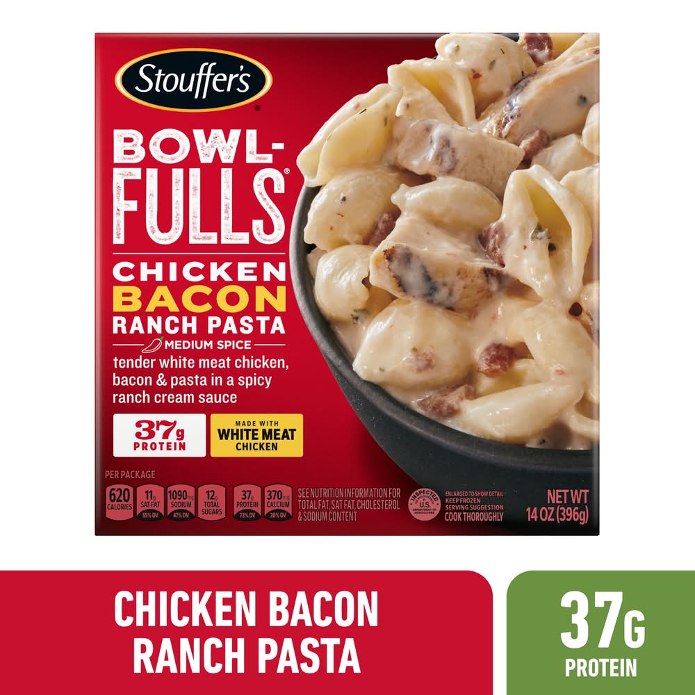 Stouffer's Bowl-Fulls Chicken Bacon Ranch Frozen Meal combines quality ingredients and delicious flavor into one quick, easy dinner. This Stouffer's frozen entree contains tender white meat chicken, shell pasta and bacon in a spicy ranch cream sauce for a meal that's sure to satisfy every taste bud. The single serving spicy ranch chicken bowl offers 36 grams of protein per serving and provides a delicious meal option for busy nights. Microwave prep makes Stouffer's chicken pasta dinner bowl a great choice when you're short on time. Keep frozen dinner in the freezer until you're ready to enjoy. Flavor: Chicken bacon ranch pasta