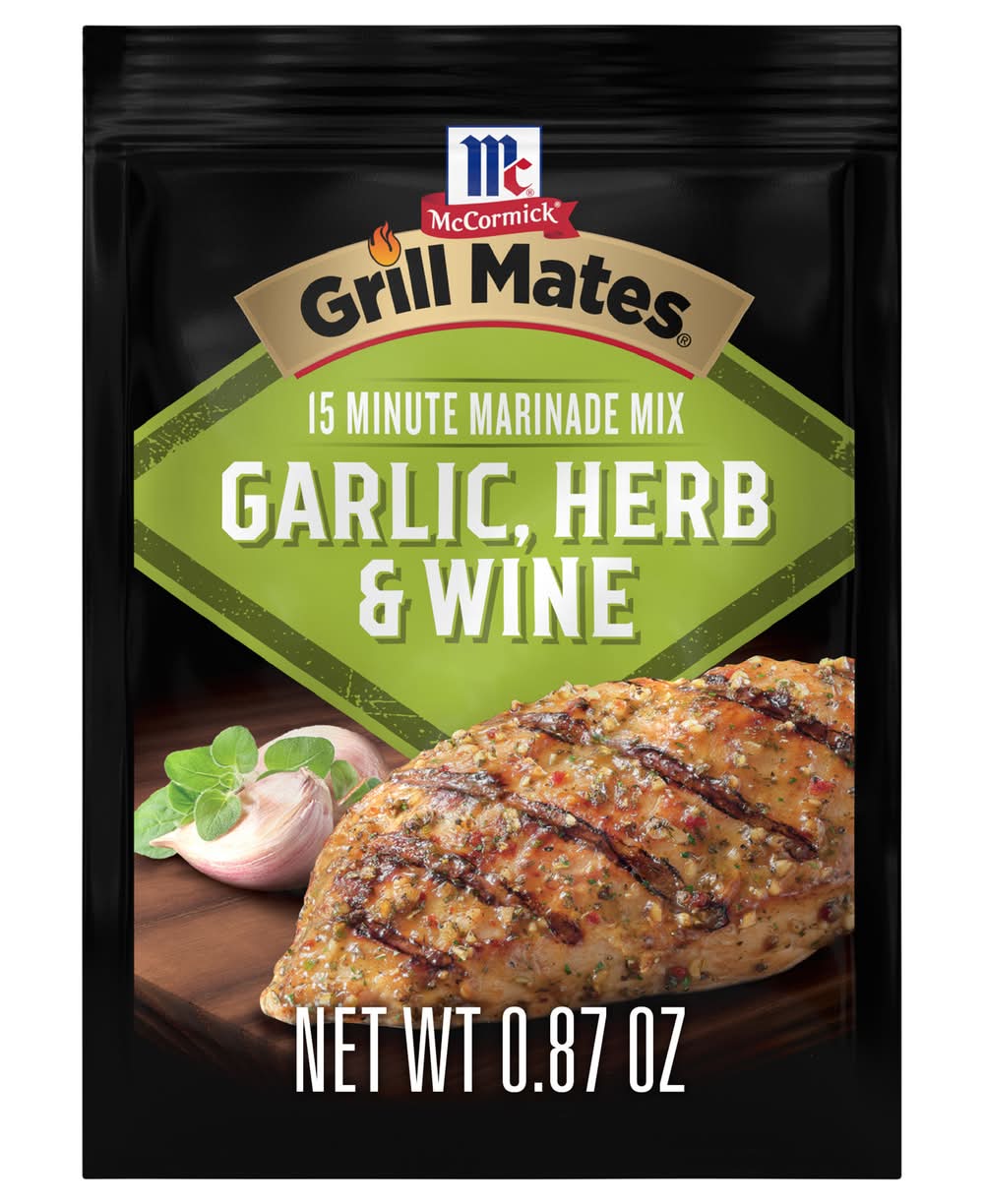 Put your grill to work with McCormick Grill Mates Garlic, Herb & Wine Marinade Seasoning Mix. A dry blend of garlic, white wine, thyme and red pepper, it brings robust flavor to whatever you're cooking ... chicken, pork, seafood or vegetables.