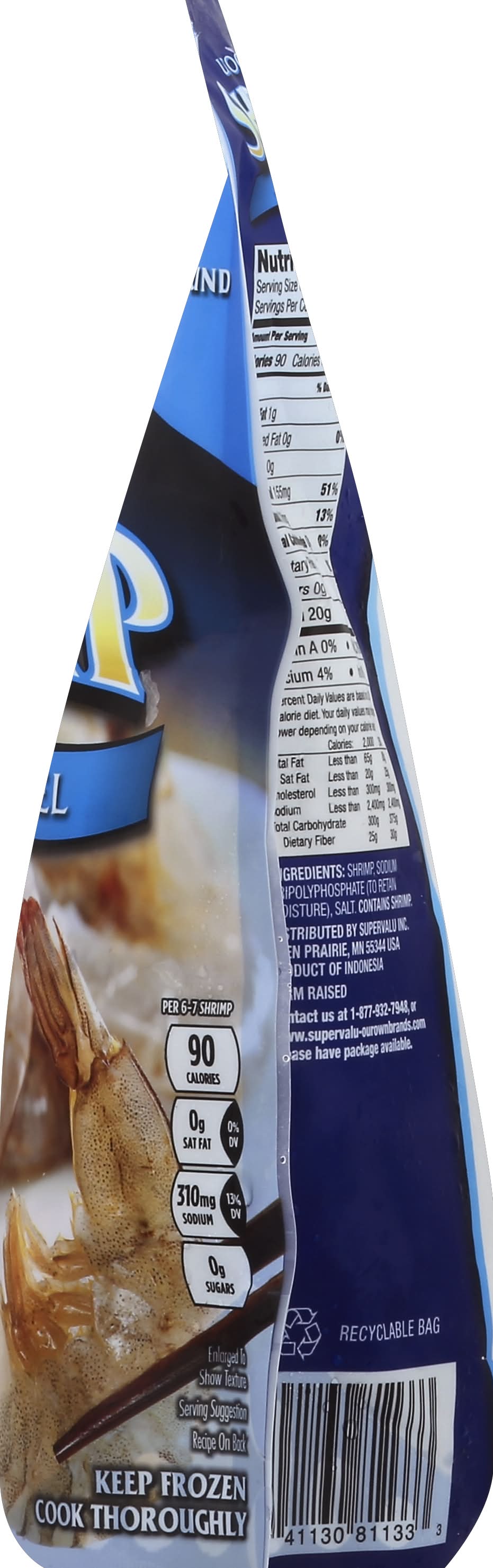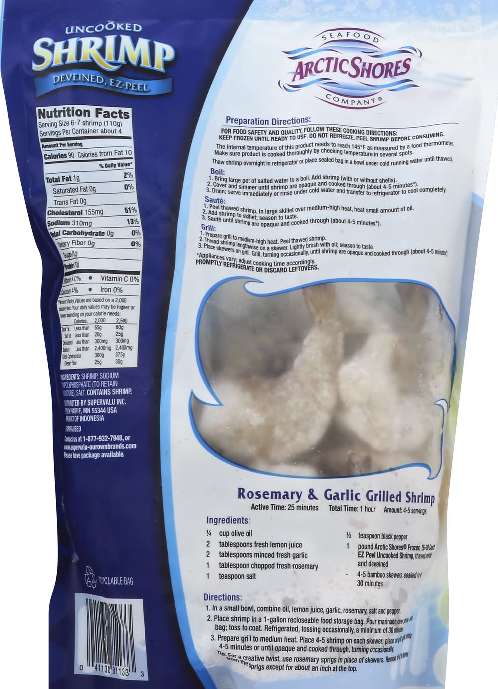Keep frozen. cook thoroughly. preparation instructions: for food safety and quality, follow these cooking directions: keep frozen until ready to use. do not refreeze. peel shrimp before consuming. the internal temperature of this product needs to reach 145 degrees f as measured by a food thermometer. make sure product is cooked thoroughly by checking temperature in several spots. thaw shrimp overnight in refrigerator or place sealed bag in a bowl under cold running water until thawed. boil: 1. bring large pot of salted water to a boil. add shrimp (with or without shells). 2. cover and simmer until shrimp are opaque and cooked through (about 4-5 minutes [appliances vary; adjust cooking time accordingly]). 3. drain; serve immediately or rinse under cold water and transfer to refrigerator to cool completely. saute: 1. peel unthawed shrimp. in large skillet over medium-high heat, heat small amount of oil. 2. add shrimp to skillet; season to taste. 3. saute until shrimp are opaque and cooked through (about 4-5 minutes [appliances vary; adjust cooking time accordingly]). grill: 1. prepare grill to medium-high heat. peel thawed shrimp. 2. thread shrimp lengthwise on a skewer. lightly brush with oil; season to taste. 3. place skewers on grill. grill, turning occasionally, until shrimp are opaque and cooked through (about 4-5 minutes [appliances vary; adjust cooking time accordingly]). promptly refrigerate or discard leftovers.