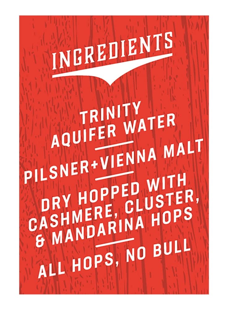 Ingredients: Trinity Aquifer Water, Pilsner + Vienna Malt, Dry Hopped with Cashmere, Cluster, & Mandarina Hops, All Hops, No Bull.