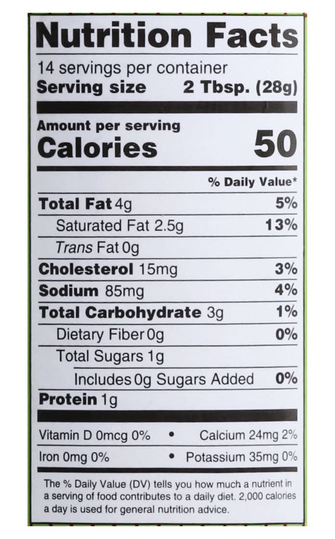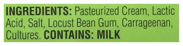 Ingredients: Pasteurized Cream, Lactic Acid, Salt, Locust Bean Gum, Carrageenan, Cultures Contains: Milk