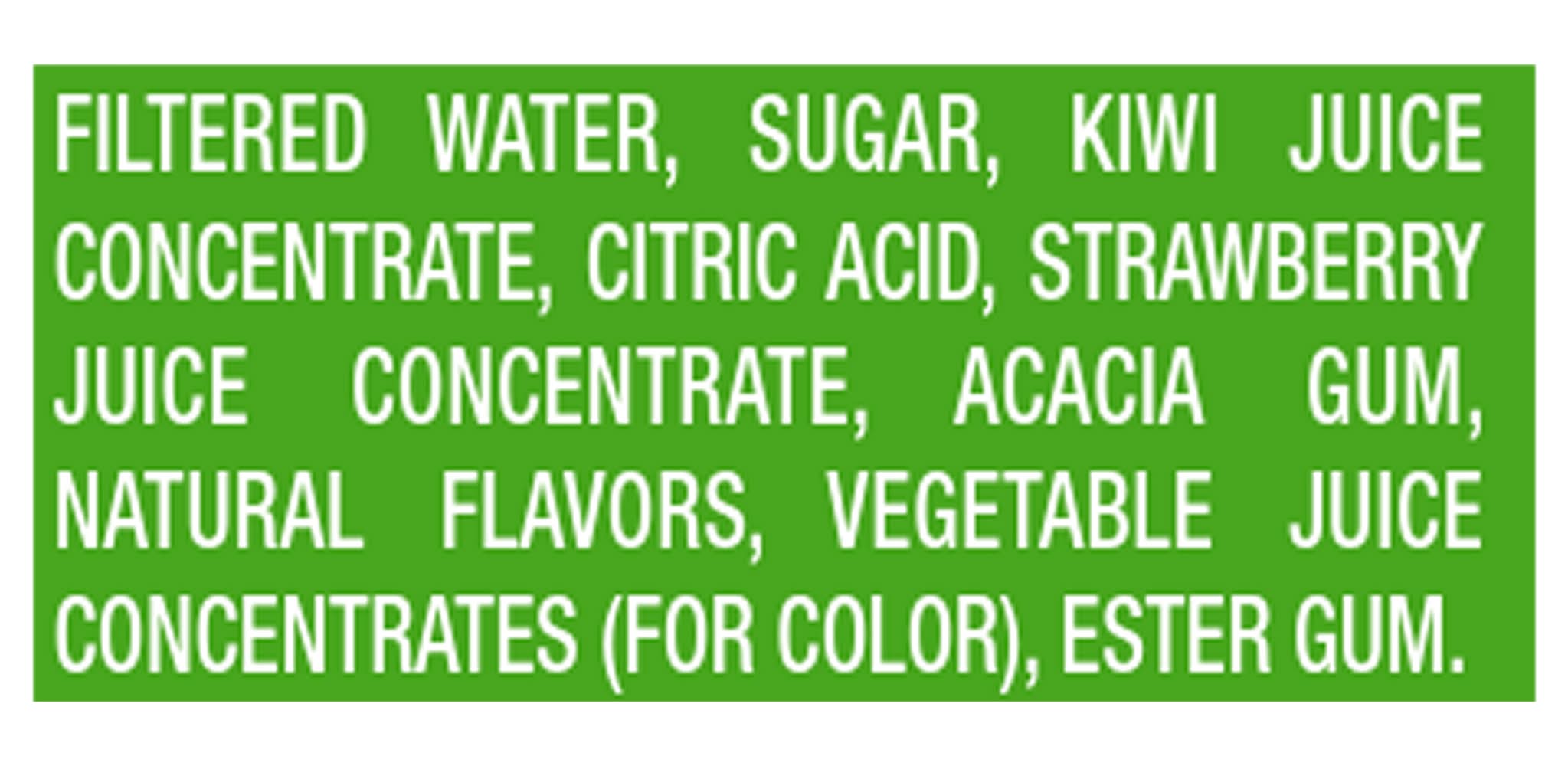 Ingredients: Filtered Water, Sugar, Kiwi Juice Concentrate, Citric Acid, Strawberry Juice Concentrate, Acacia Gum, Natural Flavors, Vegetable Juice Concentrates (for Color), Ester Gum