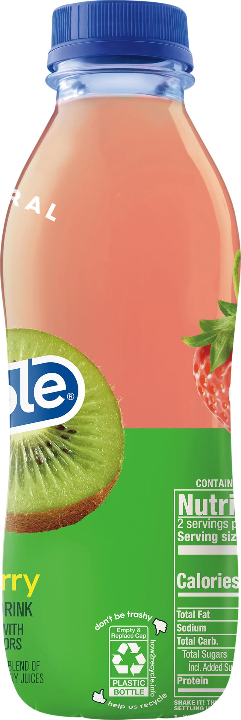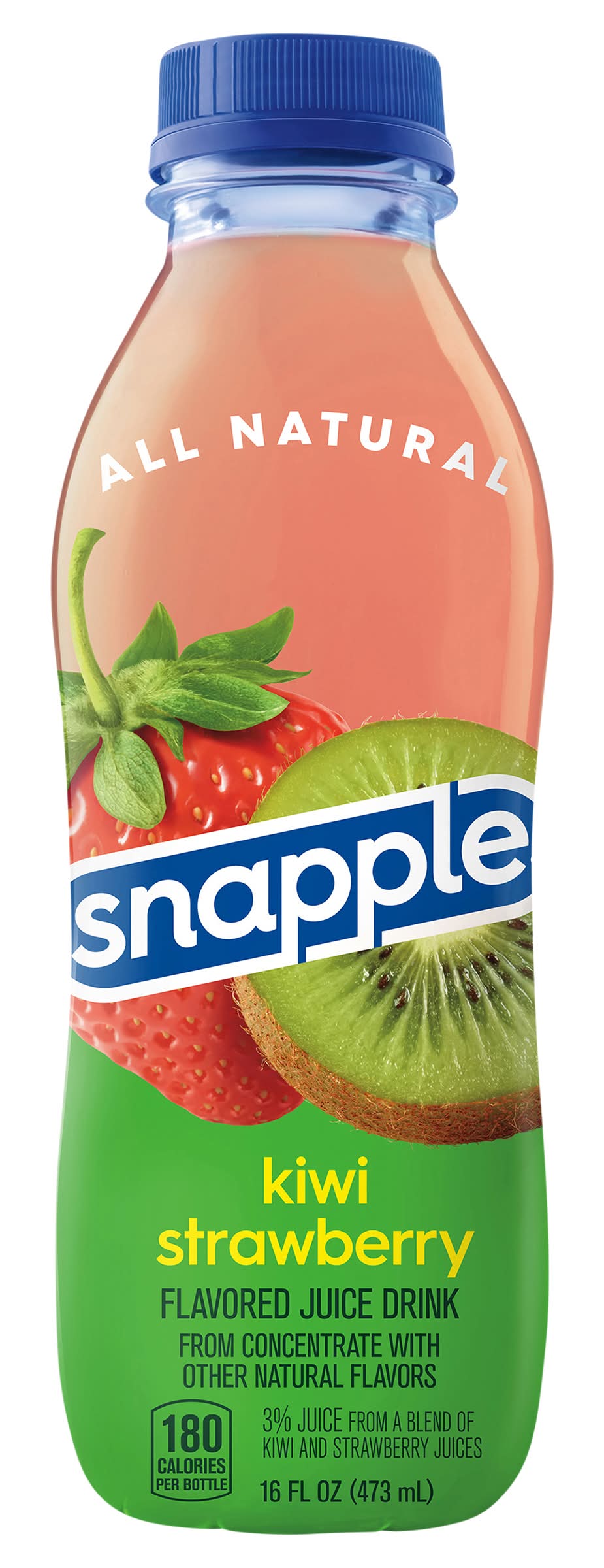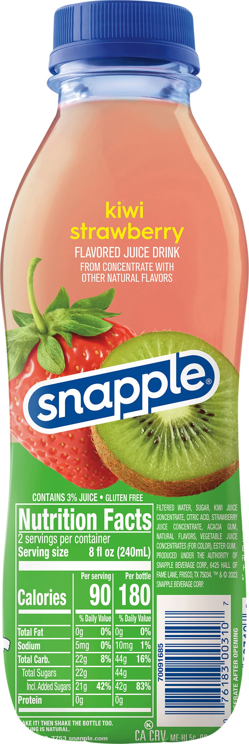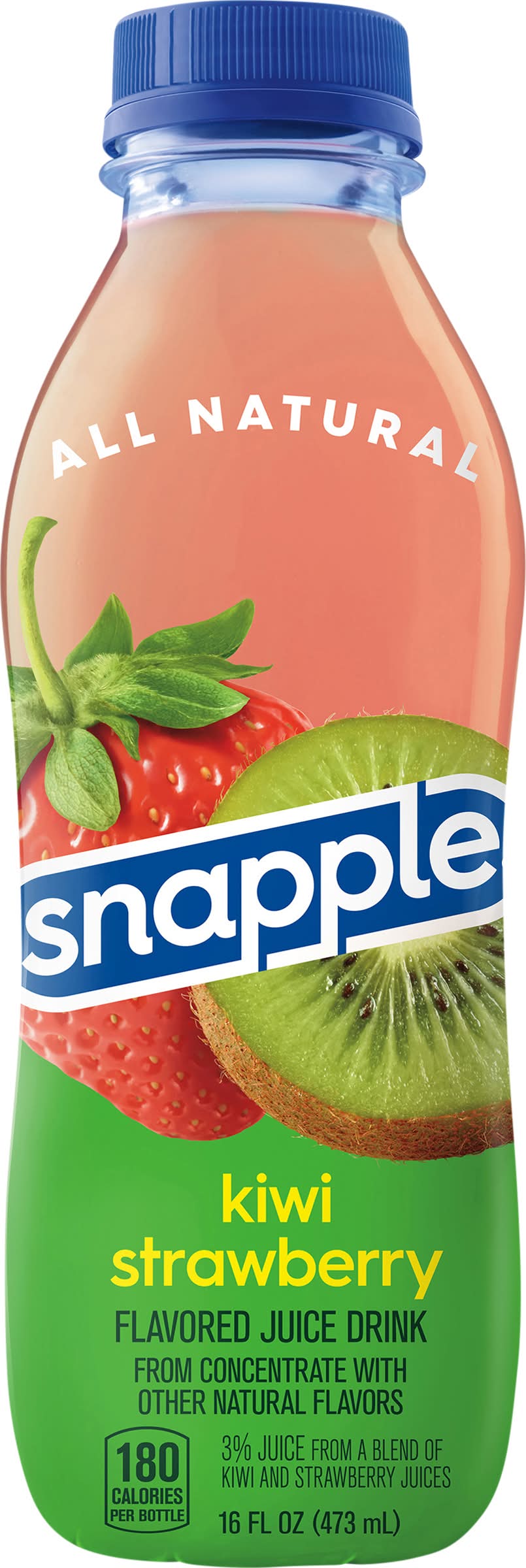 5% Juice from a blend of kiwi and strawberry juices. Juice drink from concentrate with other natural flavors. Kiwi strawberry flavored juice drink from concentrate with other natural flavors. 190 calories per bottle. Gluten free. New look same great taste. All natural. You've got a great taste. • Size: 1 • Snapple Beverage Corp., 6425 Hall of Fame Lane, Frisco, TX. • Packaging: Reusable