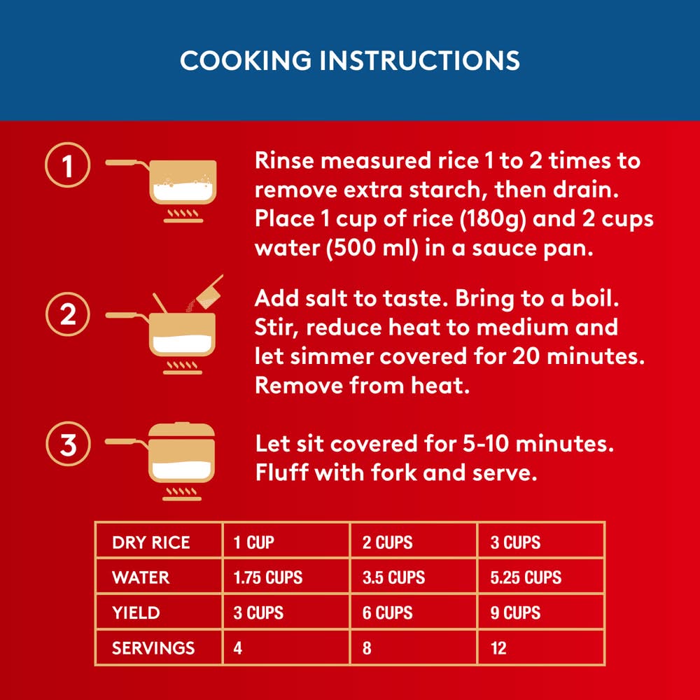 Store rice in cool and dry place. cooking instructions: 1 cup royal basmati rice. 1 1/2 cups water. pinch of salt. stove top cooking: rinse measured rice 1 to 2 time to remove extra starch, then drain. place one cup of rice (200 g) and 1 1/2 cups water (375 ml) in a sauce pan. add salt to taste. bring to a vigorous boil. stir, reduce heat to medium and let simmer covered for 12-14 minutes. remove from heat. let sit covered for 5-10 minutes. fluff with fork and serve. microwave cooking: rinse measured rice 1 to 2 times to remove extra starch, then drain. place one cup of rice (200g) and 1 1/2 cups water (375ml) in a microwave-safe bowl. add salt to taste. cover tightly with plastic wrap. cook on high setting for 6-10 minutes. carefully remove the plastic wrap, and continue to cook for another 10-12 minutes at medium setting. stir rice from time to time. remove from microwave and let sit covered for 5-10 minutes. fluff with fork and serve. if rice is too hard in the first cooking use more water. use less water if it is too soft. electric rice cooker: rinse measured rice 1 to 2 times to remove extra starch, then drain. place one cup of rice (200g) and 1 1/2 cups water (375ml) in an electric rice cooker. add salt to taste. cover the cooker, turn it on, and cook for 30 minutes. fluff with fork and serve.