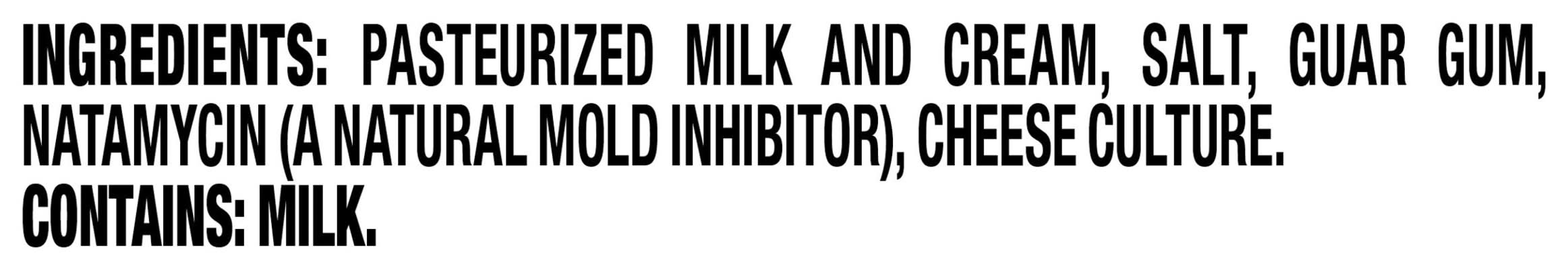 Ingredients: PASTEURIZED MILK AND CREAM, SALT, GUAR GUM, NATAMYCIN (A NATURAL MOLD INHIBITOR), CHEESE CULTURE. Contains: Milk