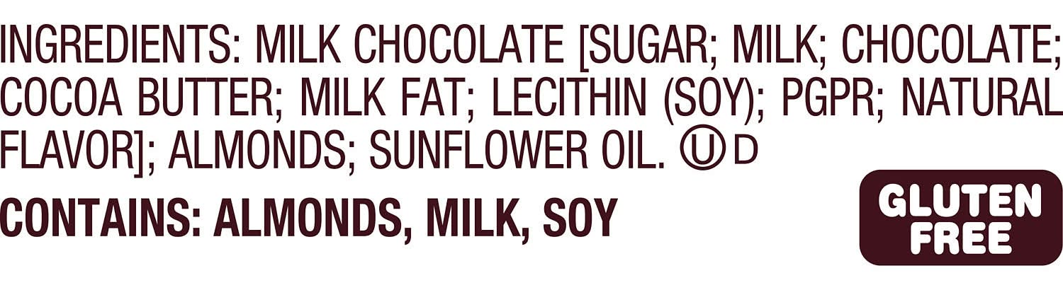 Ingredients: MILK CHOCOLATE [SUGAR; MILK; CHOCOLATE; COCOA BUTTER; MILK FAT; LECITHIN (SOY); PGPR; NATURAL FLAVOR]; ALMONDS; SUNFLOWER OIL Contains: Tree Nuts, Milk, Soybeans