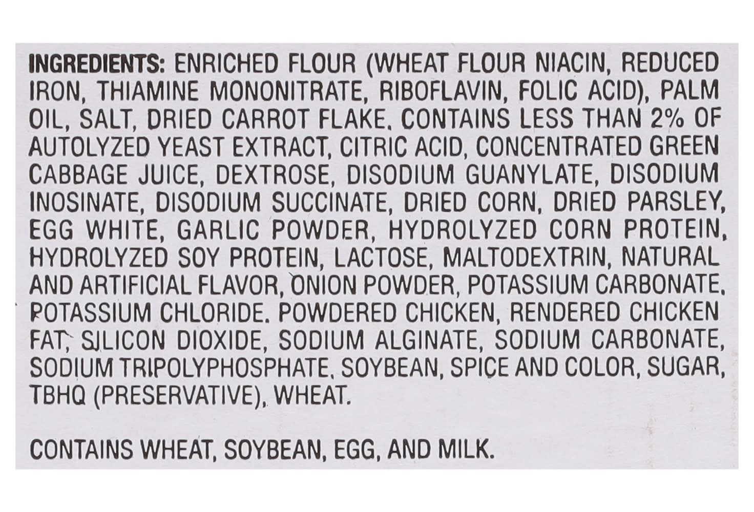 Ingredients: Enriched Flour (Wheat Flour Niacin, Reduced Iron, Thiamine Mononitrate, Riboflavin, Folic Acid), Palm Oil, Salt, Dried Carrot Flake, Contains Less than 2% of Autolyzed Yeast Extract, Citric Acid, Concentrated Green Cabbage Juice, Dextrose, Disodium Guanylate, Disodium Inosinate, Disodium Succinate, Dried Corn, Dried Parsley, Egg White, Garlic Powder, Hydrolyzed Corn Protein, Hydrolyzed Soy Protein, Lactose, Maltodextrin, Natural and Artificial Flavor, Onion Powder, Potassium Carbonate, Potassium Chloride, Powdered Chicken, Rendered Chicken Fat, Silicon Dioxide, Sodium Alginate, Sodium Carbonate, Sodium Tripolyphosphate, Soybean, Spice and Color, Sugar, TBHQ (Preservative), Wheat Contains: Wheat, Soybeans, Eggs, Milk, Corn, Lactose