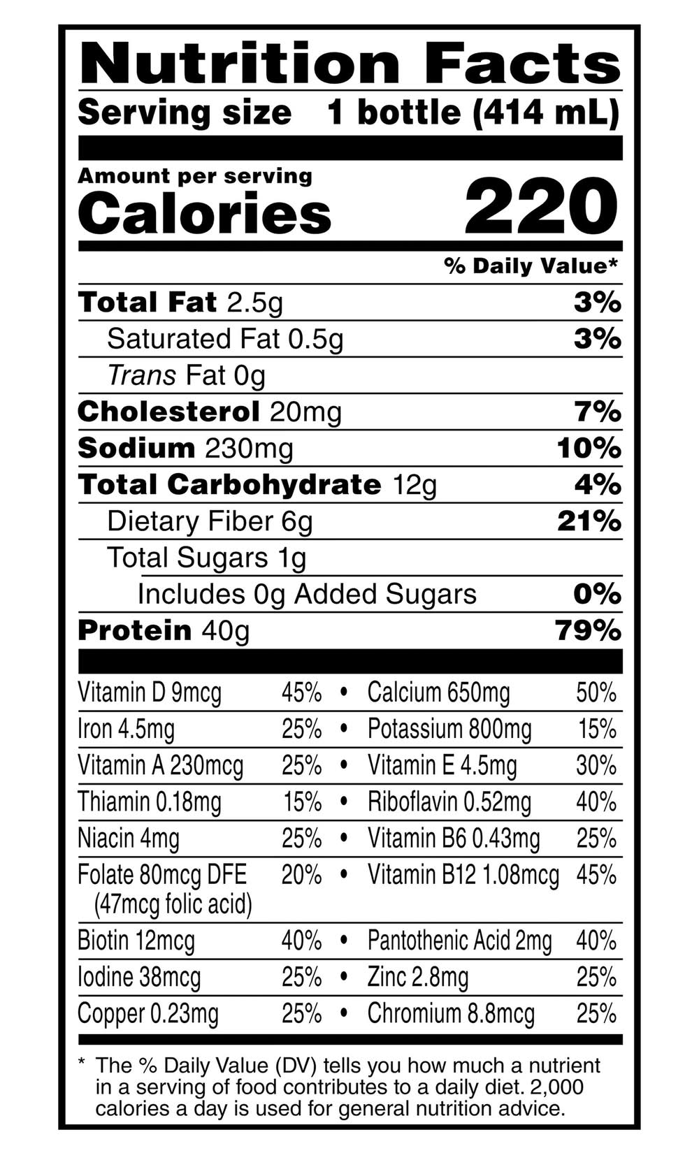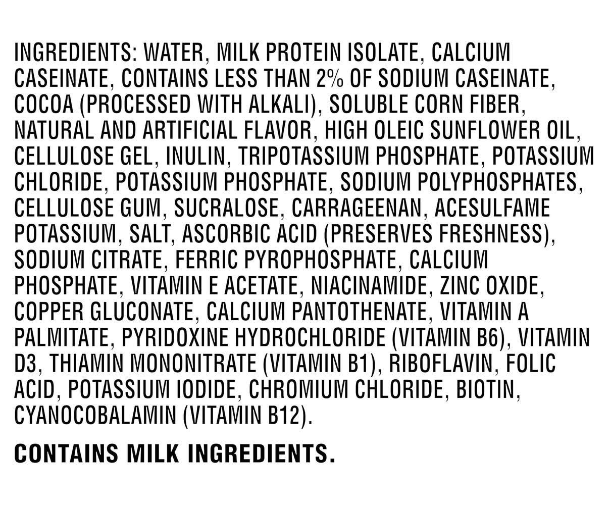 Ingredients: Water, Milk Protein Isolate, Calcium Caseinate (Milk Derivative), Contains Less than 2% of Sodium Caseinate (Milk Derivative), Cocoa (Processed with Alkali), Soluble Corn Fiber, Natural and Artificial Flavor, High Oleic Sunflower Oil, Cellulose Gel, Inulin, Tripotassium Phosphate, Potassium Chloride, Potassium Phosphate, Sodium Polyphosphates, Cellulose Gum, Sucralose, Carrageenan, Acesulfame Potassium, Salt, Ascorbic Acid (Vitamin C), Sodium Citrate, Ferric Pyrophosphate, Calcium Phosphate, Vitamin E Acetate, Niacinamide, Zinc Oxide, Copper Gluconate, Calcium Pantothenate, Vitamin A Palmitate, Pyridoxine Hydrochloride (Vitamin B6), Vitamin D3, Thiamin Mononitrate (Vitamin B1), Riboflavin, Folic Acid, Potassium Iodide, Chromium Chloride, Biotin, Cyanocobalamin (Vitamin B12) Contains: Milk, Corn