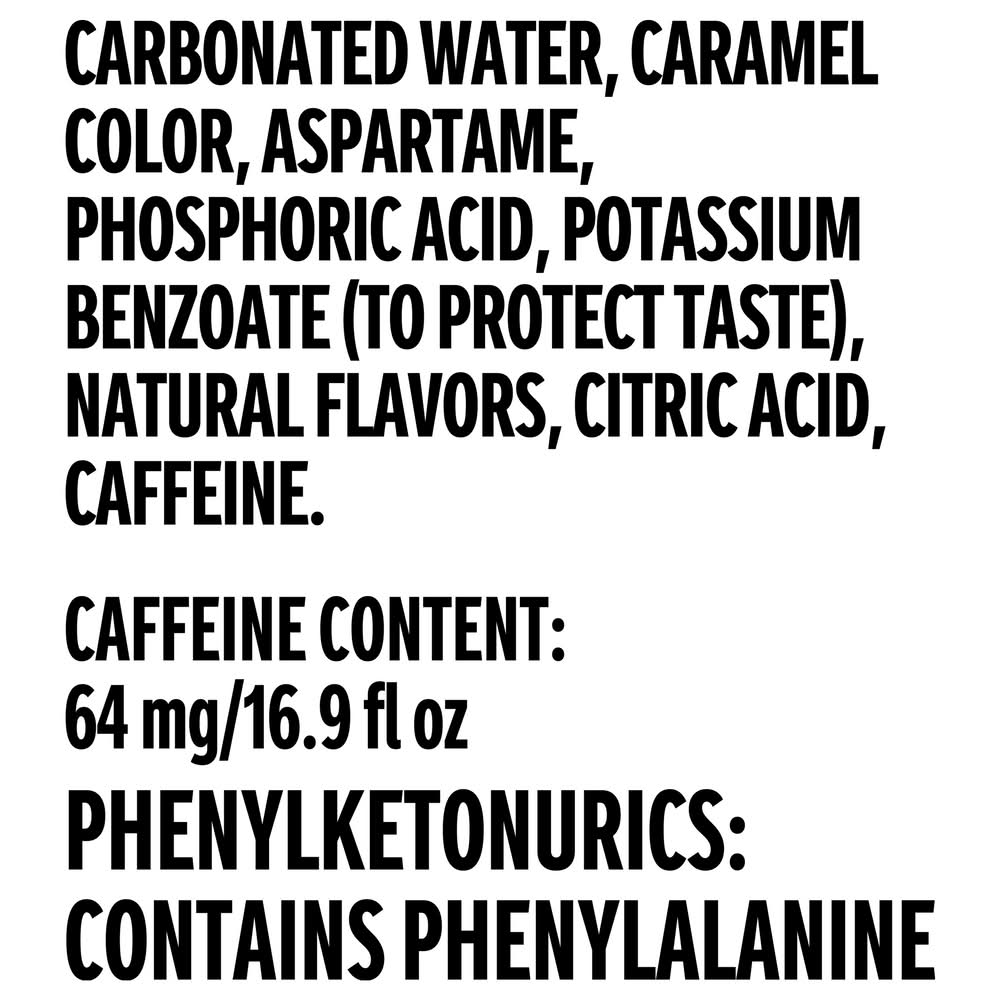 Ingredients: Carbonated Water, Caramel Color, Aspartame, Phosphoric Acid, Potassium Benzoate (To Protect Taste), Natural Flavors, Citric Acid, Caffeine.