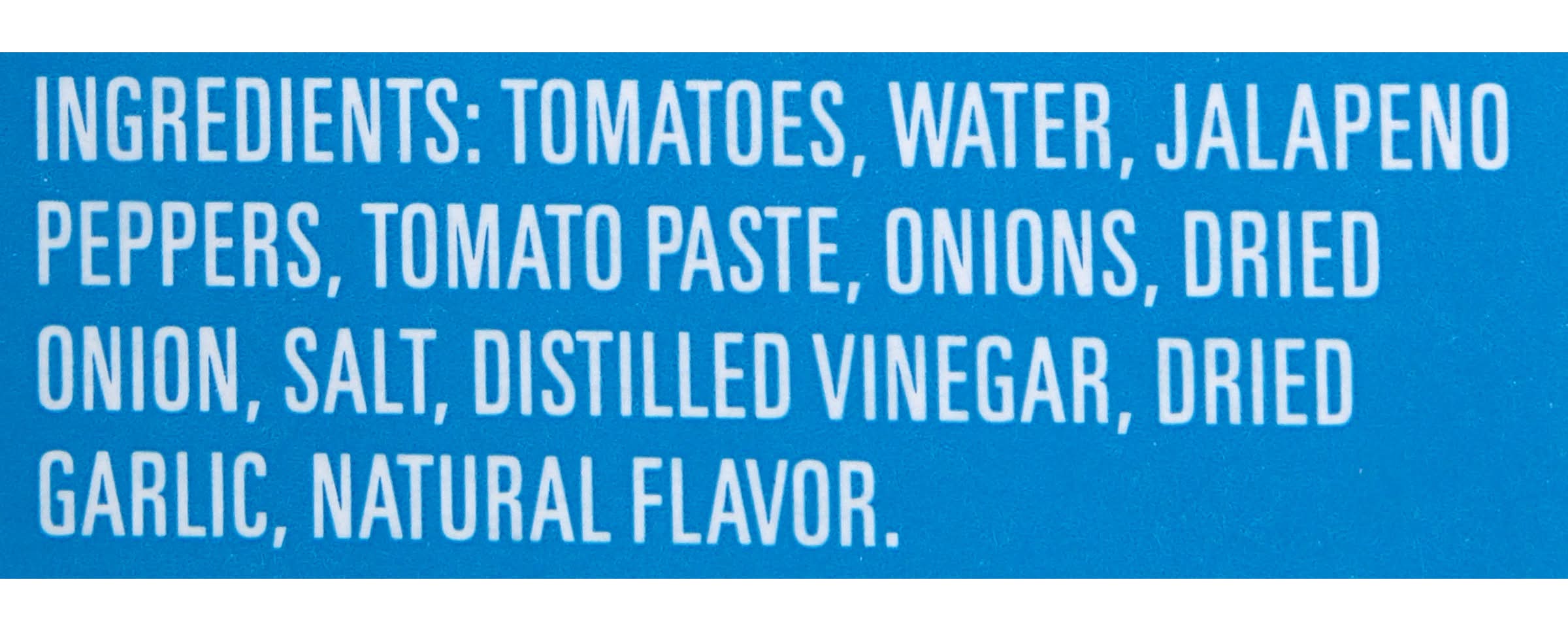 Ingredients: Diced Tomatoes, Water, Jalapeno Peppers, Tomato Paste, Onions, Distilled Vinegar, Dehydrated Onions, Salt, Dehydrated Garlic, Natural Flavor
