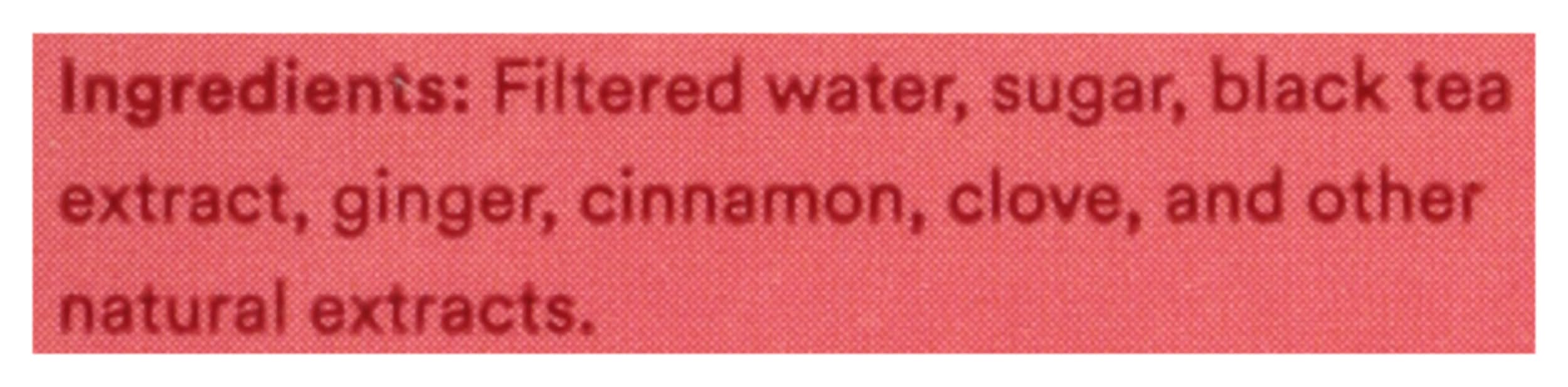 Ingredients: Filtered Water, Sugar, Black Tea Extract, Ginger, Cinnamon, Clove, and Other Natural Extracts
