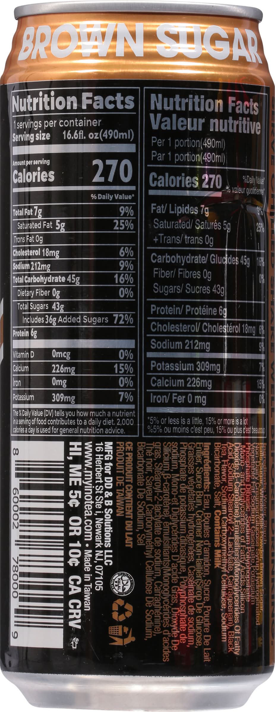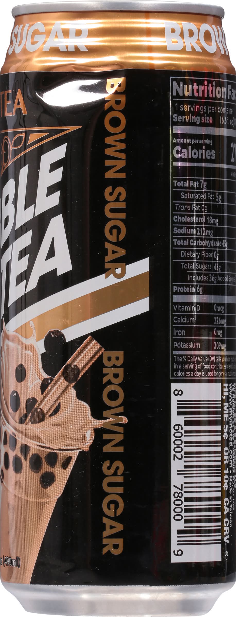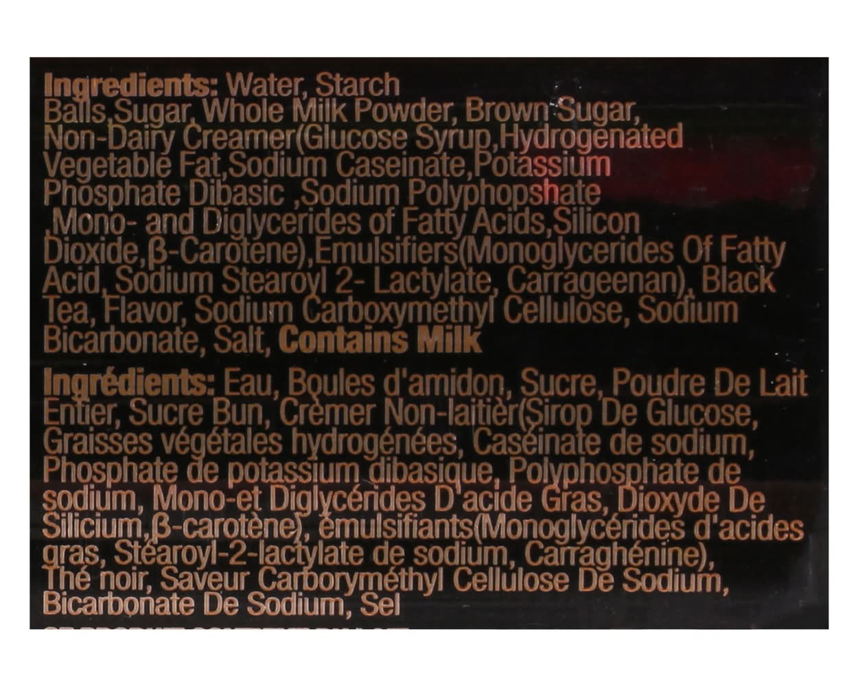 Ingredients: Water, Starch Balls, Sugar, Whole Milk Powder, Brown Sugar, Non-Dairy Creamer(Glucose Syrup, Hydrogenated Vegetable Fat, Sodium Caseinate, Potassium Phosphate Dibasic, Sodium Polyphopshate Mono- and Diglycerides of Fatty Acids, Silicon Dioxide, B-Carotene), Emulsifiers(Monoglycerides of Fatty Acid, Sodium Stearoyl 2- Lactylate, Carrageenan), Black Tea, Flavor, Sodium Carboxymethyl Cellulose, Sodium Bicarbonate, Salt Contains: Milk