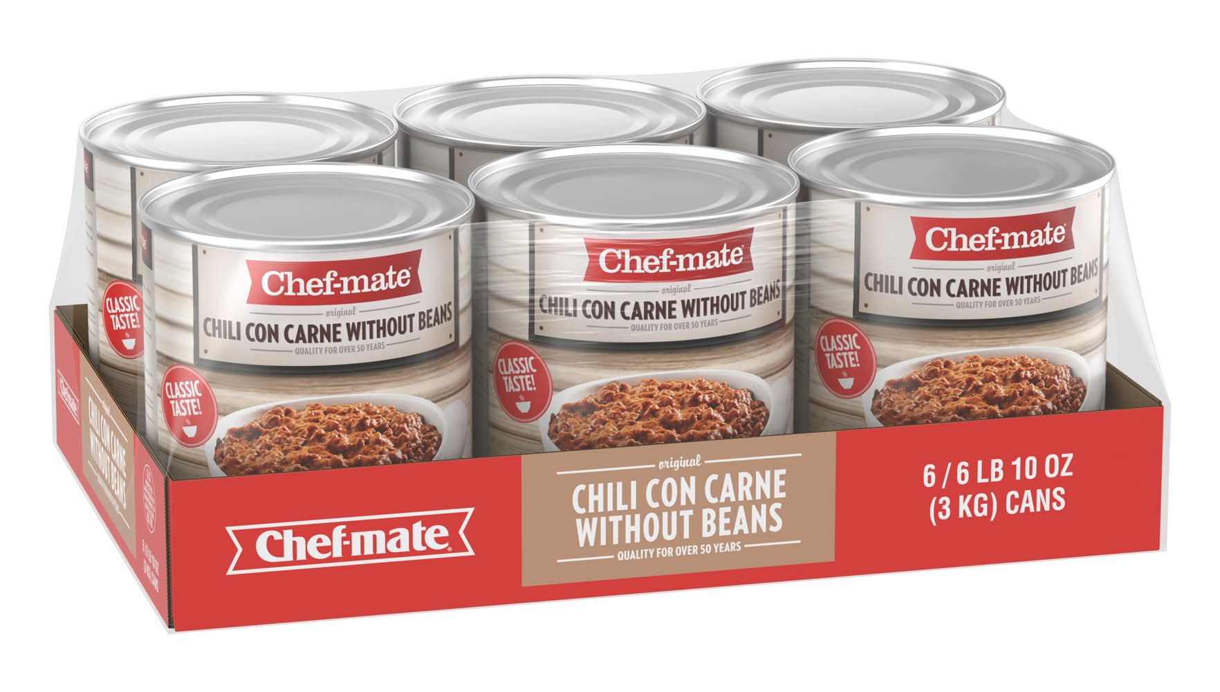 Chef-Mate Chili Con Carne Without Beans is a ready-to-eat product featuring beef slow-cooked in a well-seasoned tomato sauce. The product has been inspected and passed by the Department of Agriculture, ensuring its quality, which has been maintained for over 50 years. Consumers are encouraged to recycle the packaging after use. • Size: 6 • Number of servings: 12 • Packaging: Reusable
