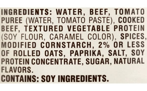Ingredients: INGREDIENTS: WATER, BEEF, TOMATO PUREE (WATER, TOMATO PASTE), COOKED BEEF, TEXTURED VEGETABLE PROTEIN (SOY FLOUR, CARAMEL COLOR), SPICES, MODIFIED CORNSTARCH, 2% OR LESS OF ROLLED OATS, PAPRIKA, SALT, SOY PROTEIN CONCENTRATE, SUGAR, NATURAL FLAVORS. Contains: Soyabeans