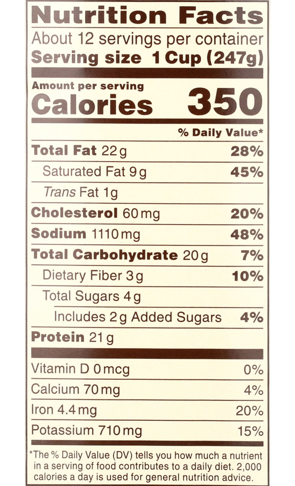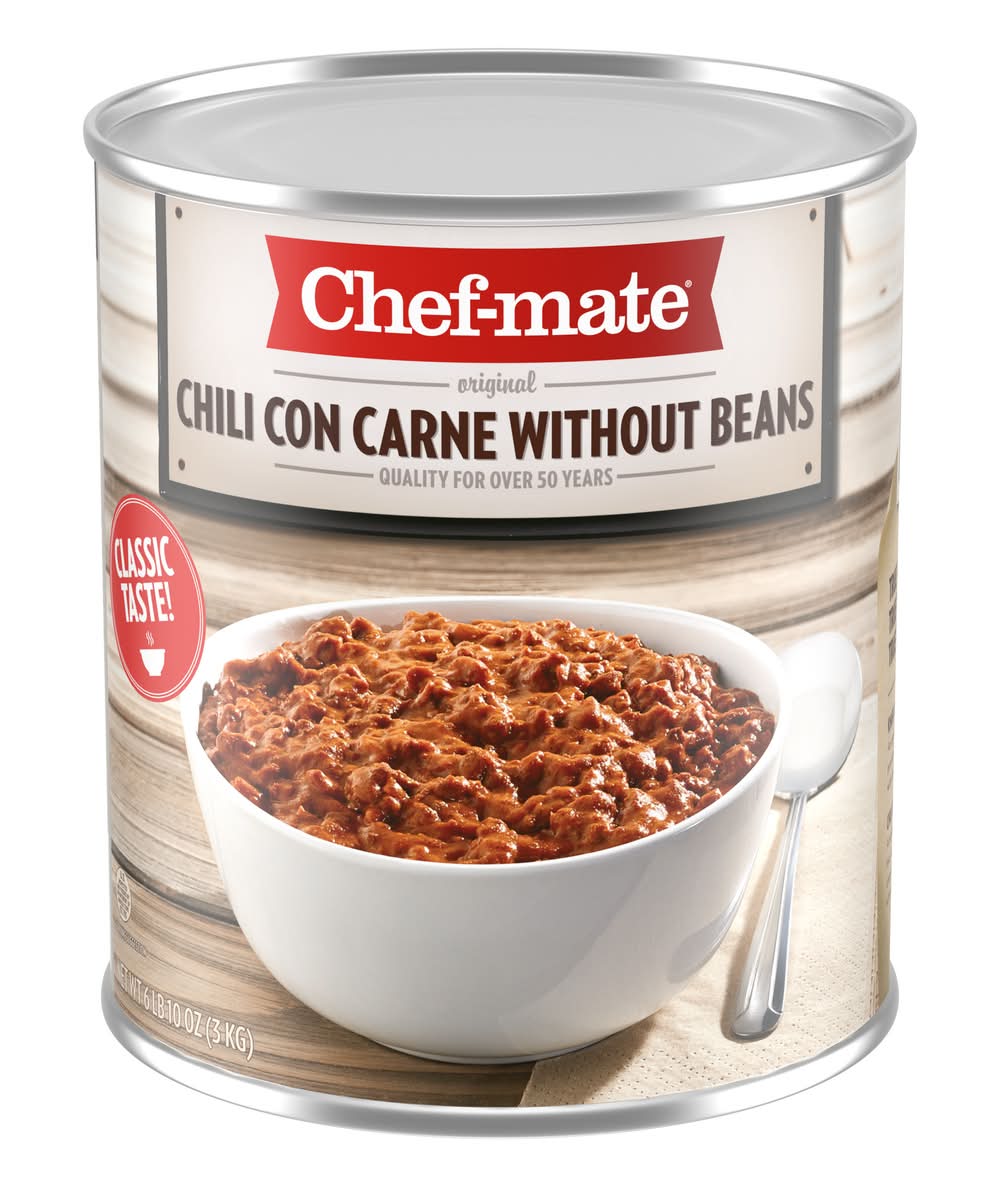 Directions for use: Stovetop: Heat contents of 10 can to desired temperature in heavy saucepan, stirring frequently, over medium heat. Steam Jacketed Kettle: Heat contents of #10 can, to desired temperature, stirring frequently. Pressure or Convection Steamer: Place contents of 10 can in half steamtable pan, cover tightly. Steam in pressure or convection steamer to desired temperature. Microwave Oven: Microwave in microwave-safe container to desired temperature, cover and vent. Stir once during heating. Store remaining unheated portions in tightly sealed plastic container and refrigerate. Knife and Fork Chili Burger: An open faced hamburger smothered with a piping hot! portion of Chef-mate Chili without Beans topped with shredded cheddar. Chili Cheese Fries A basket of golden brown French fries, waffle cut fries, or thick cut homemade potato chips, drizzled with a creamy cheese sauce and then covered with Chef-mate. Chili without Beans. Garnish with some sliced scallions. Refrigerate after opening. Storage recommendation: Refrigerate after opening.