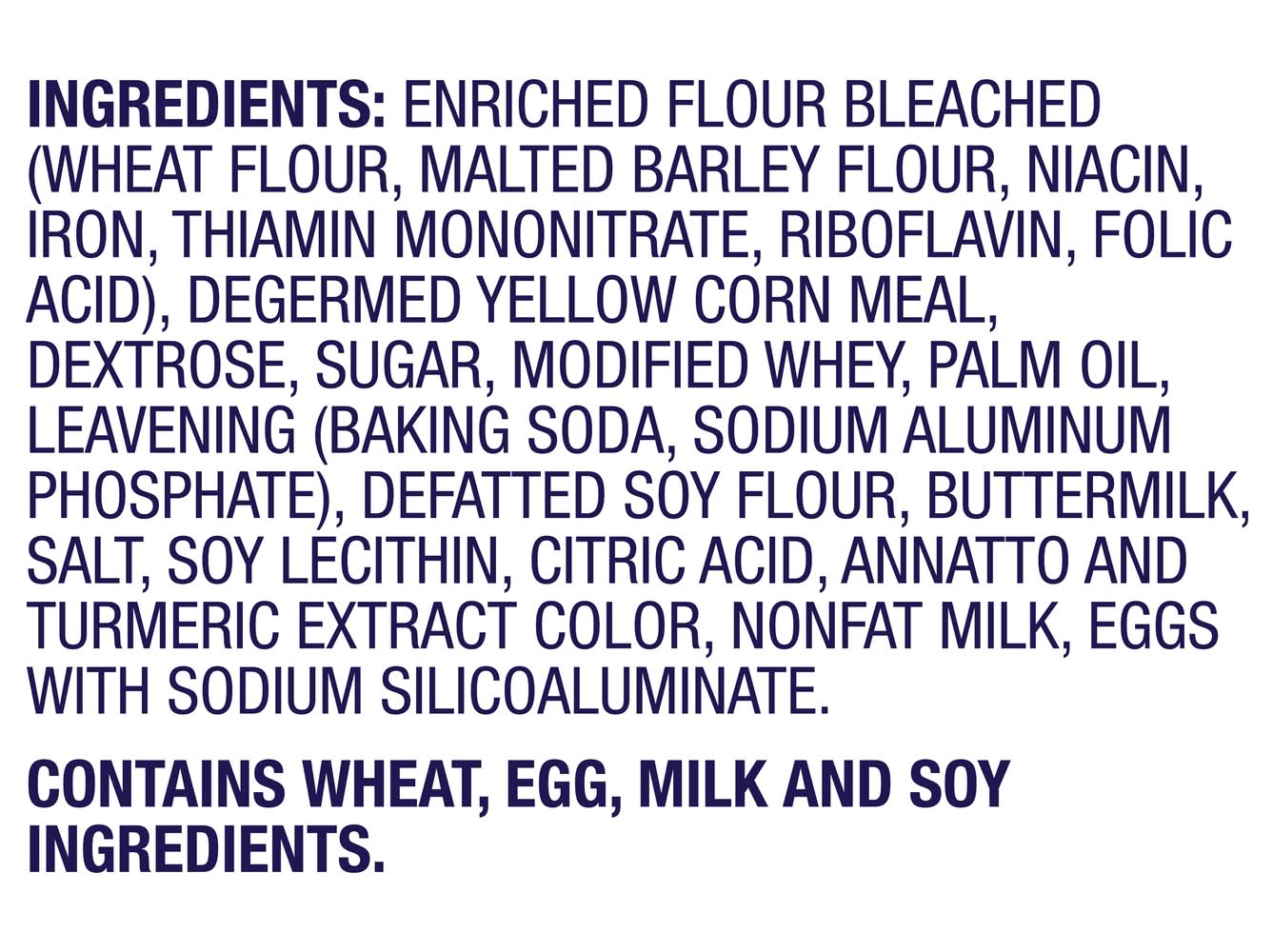 Ingredients: Enriched Flour Bleached (Wheat Flour, Malted Barley Flour, Niacin, Iron, Thiamin Mononitrate, Riboflavin, Folic Acid), Degermed Yellow Corn Meal, Dextrose, Sugar, Modified Whey, Palm Oil, Leavening (Baking Soda, Sodium Aluminum Phosphate), Defatted Soy Flour, Buttermilk, Salt, Soy Lecithin, Citric Acid, Annatto and Turmeric Extract Color, Nonfat Milk, Eggs with Sodium Silicoaluminate Contains: Wheat, Eggs, Milk, Soybeans, Barley