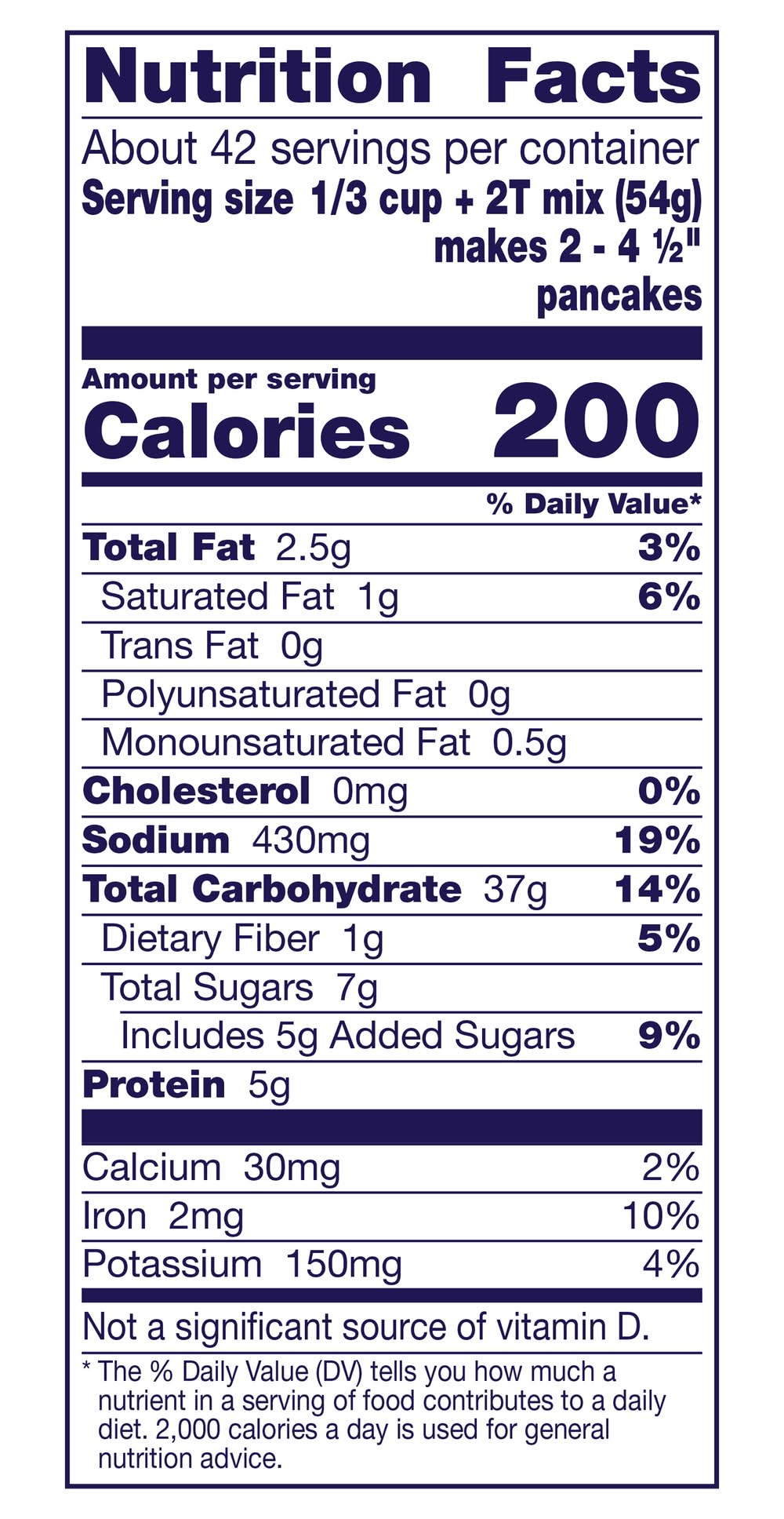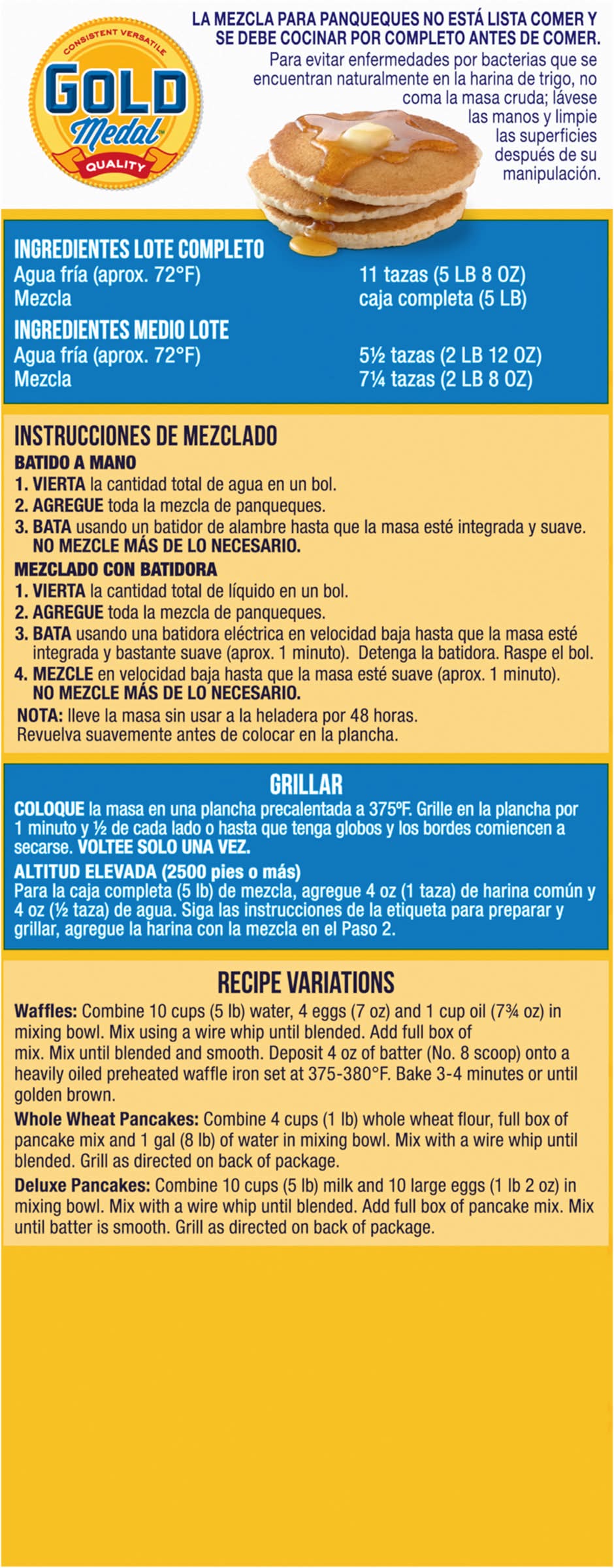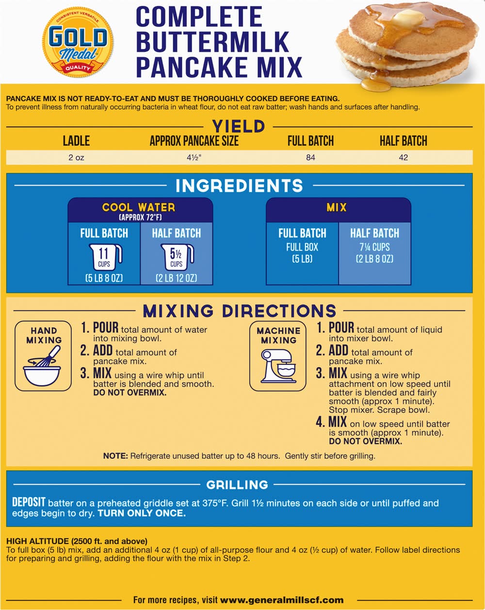Directions: pancake mix is not ready-to-eat and must be thoroughly cooked before eating. to prevent illness from naturally occurring bacteria in wheat flour, do not eat raw butter; wash hands and surfaces after handling. yield: ladle: 2 oz; approx pancake size: 4 1/2 inches; full batch: 84; half batch: 42. ingredients: cool water (approx 72 degrees f): full batch 11 cups (5 lb 8 oz); half batch 5 1/2 cups (2 lb 12 oz). mix: full batch full box (5 lb); half batch 7 1/4 cups (2 lb 8 oz. mixing directions: hand mixing: 1. pour total amount of water into mixing bowl. 2. add total amount of pancake mix. 3. mix using a wire whip until batter is blended and smooth. do not overmix. machine mixing: 1. pour total amount of liquid into mixer bowl. 2. add total amount of pancake mix. 3. mix using a wire whip attachment on low speed until batter is blended and fairly smooth (approx 1 minute). stop mixer. scrape bowl. 4. mix on low speed until batter is smooth (approx 1 minute). do not remix. note refrigerate unused batter up to 48 hours. gently stir before grilling. grilling: deposit batter on a preheated griddle set at 375 degrees f. grill 1 1/2 minutes on each side or until puffed and edges begin to dry. turn only once. high altitude (2500 ft. and above): to full box (5 lb) mix, add an additional 4 oz (1 cup) of all-purpose flour and 4 oz (1/2 cup) of water. follow label directions for preparing and grilling, adding the flour with the mix in step 2.